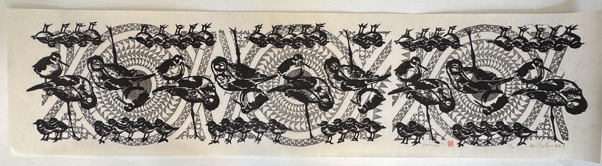 This series of eight landscapes was created by repeated printing of small blocks to create patterns. #7 is an edition of six, with avocet and peep printed against a background of repeating grape vines, a mokuhanga woodcut on gampi.