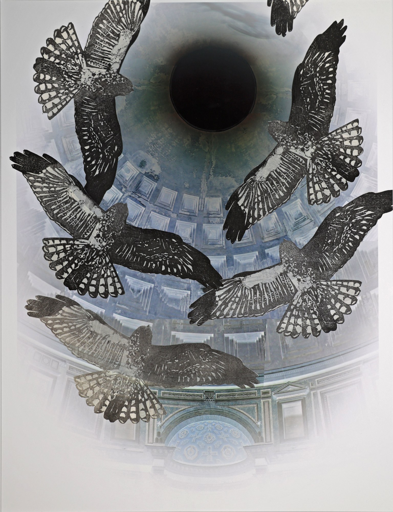 This unque print is part of a series of mokuhanga birds hand printed on lightweight, translucent Japanese washi, collaged on digital backgrounds of my own photographs of architecture and landscapes. The series was begun at the Mokuhanga Project Space in Walla Walla, Washington in January 2024. The digital printing was done by Benjamin Selby.