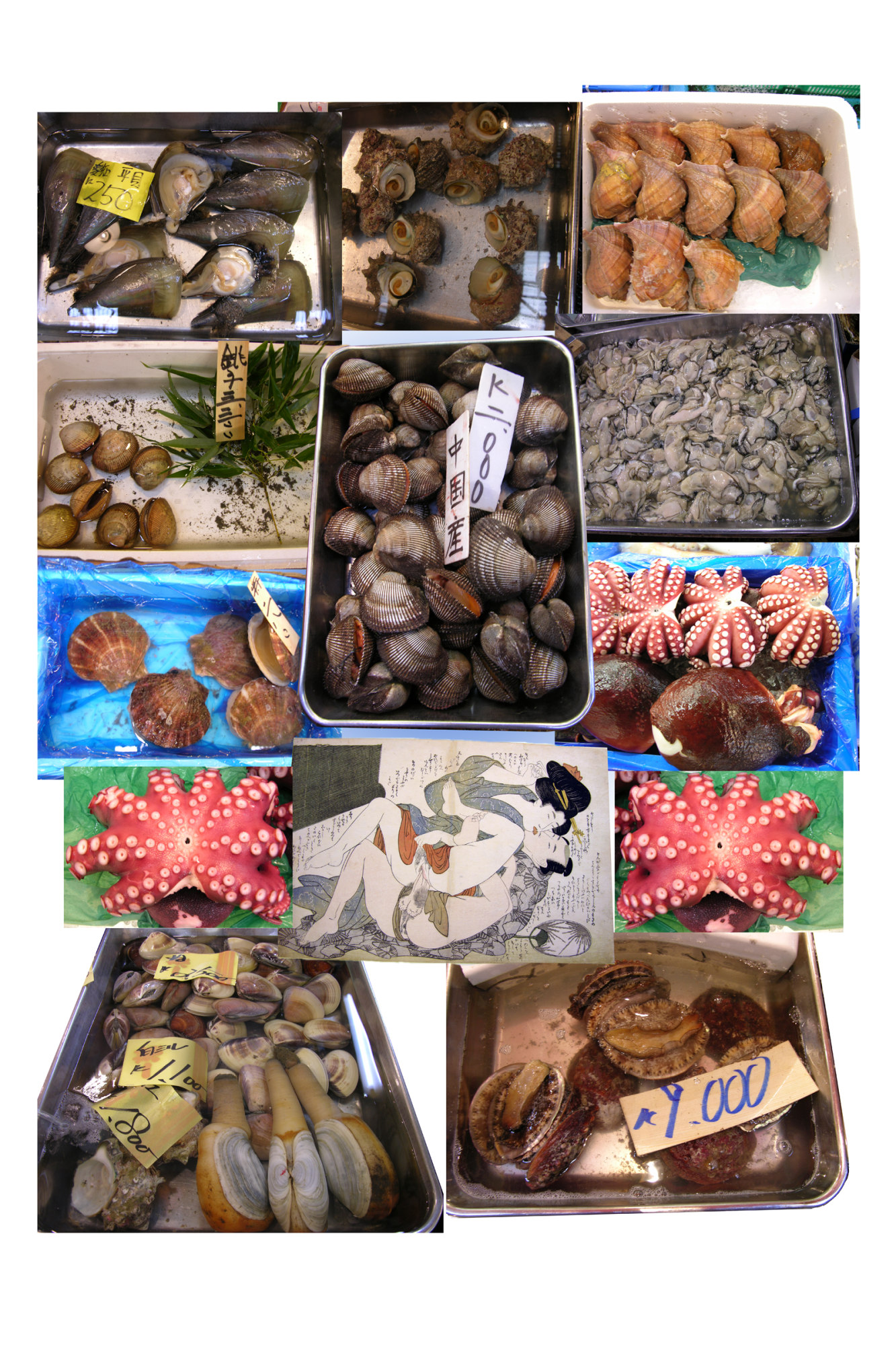 A collage of photographs of the displays of fish for sale at the central fish market in Tokyo, matched with Japanese cultural treasures on display at the Tokyo National Museum.
