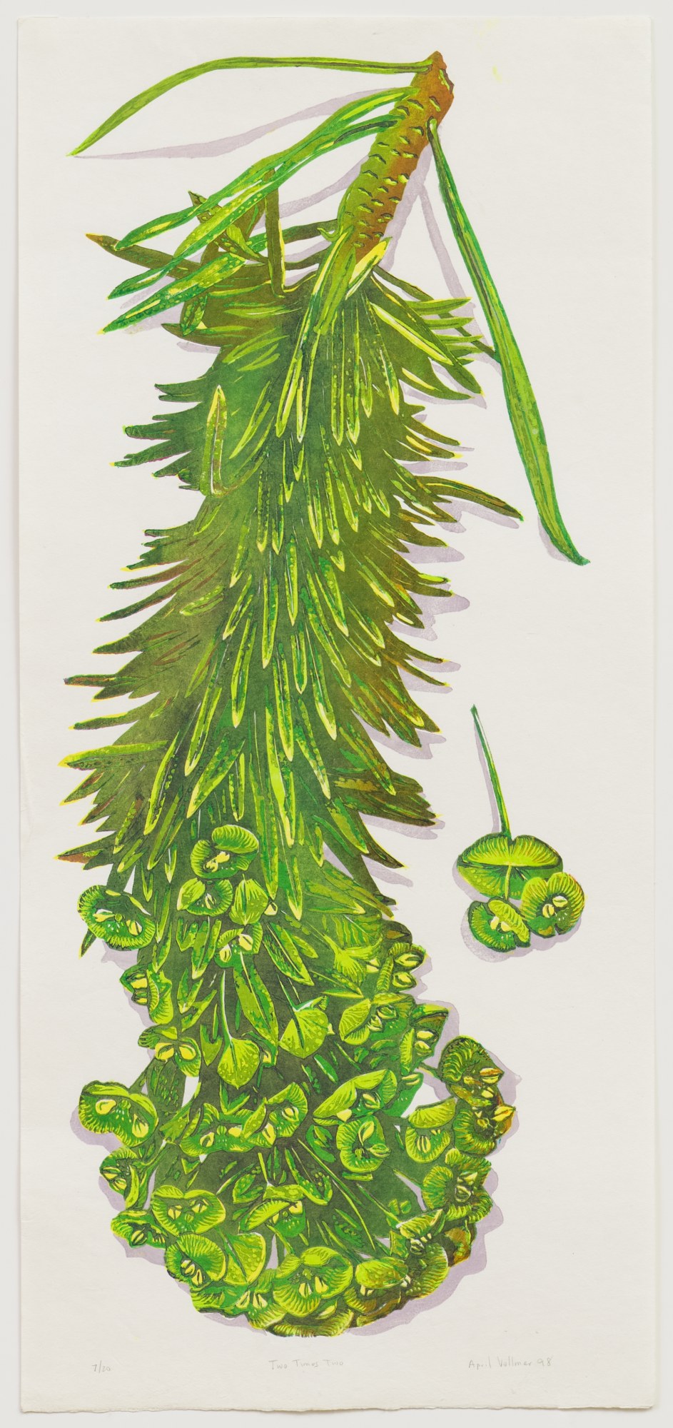 two times two repeated forms in this euphorbia stem, reduction cut with a separate block for the purple shadow. Euphorbia characias, var. wulfenia