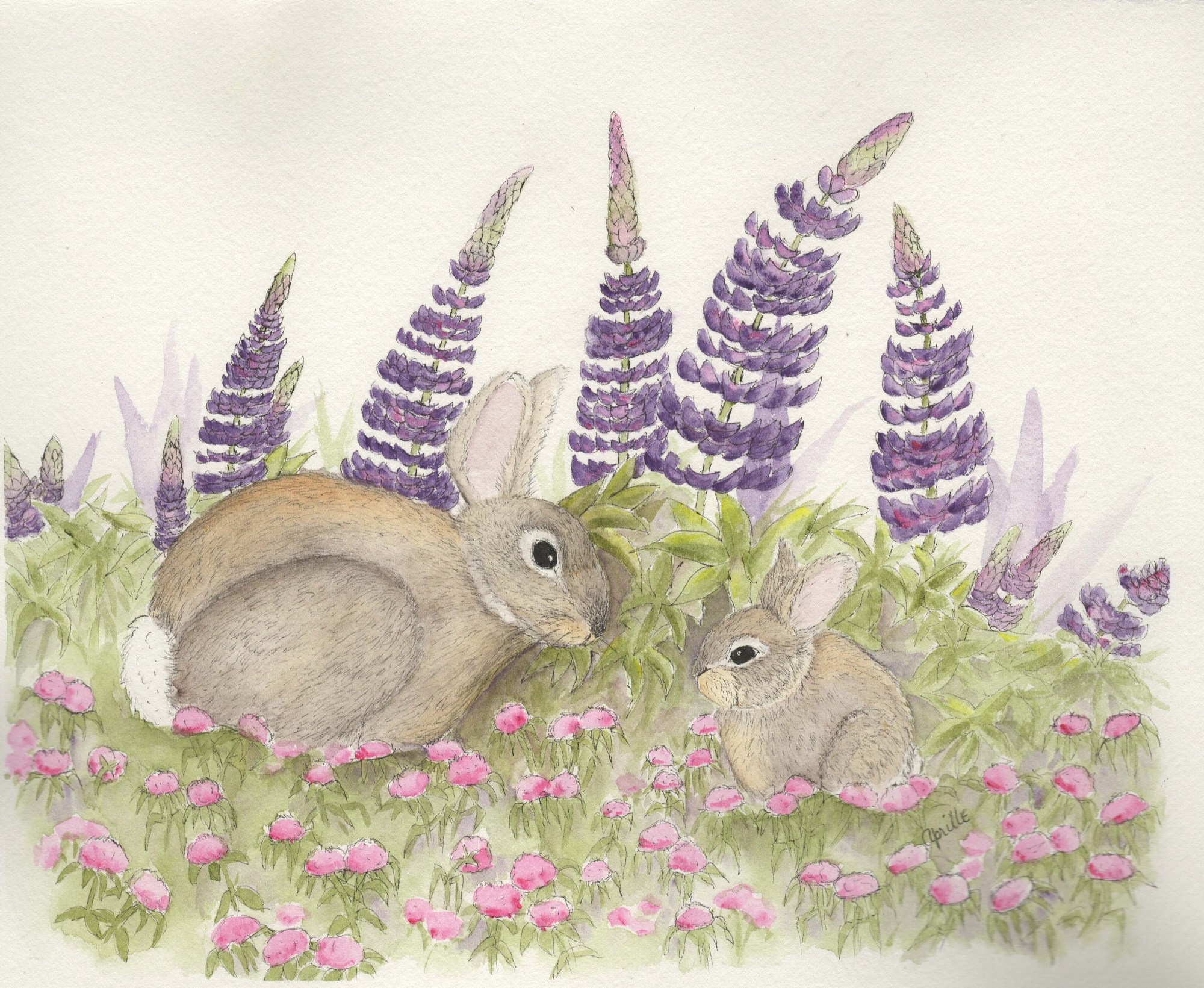 This mamma rabbit and her baby bun are enjoying a spring day surrounded by lupines and wild clover.