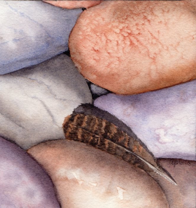 This painting was the final one in a series of four small watercolours and I needed something to 'tell a story'. Stumped, I went for a walk along the cliffs. When I spotted some beautiful feathers on the path I knew I had my story.