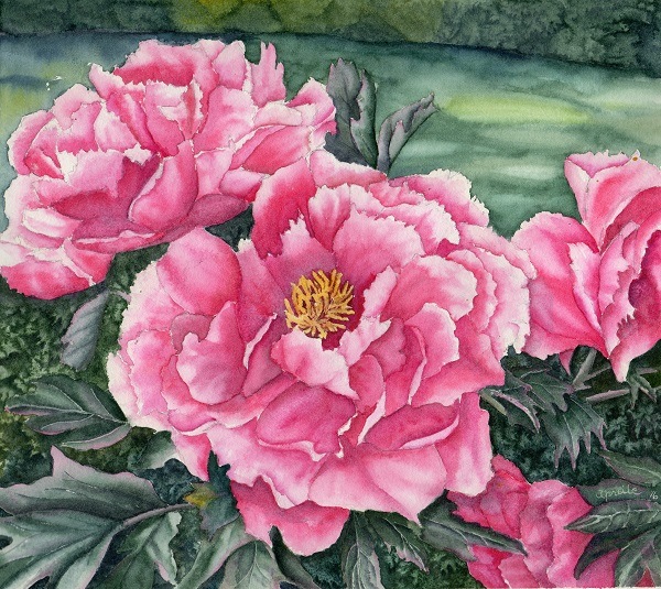 One in my series of Japanese peonies. Rather than focusing on just one blossom I wanted to capture the impact of full bloom. Definitely a regal show, don't you think?