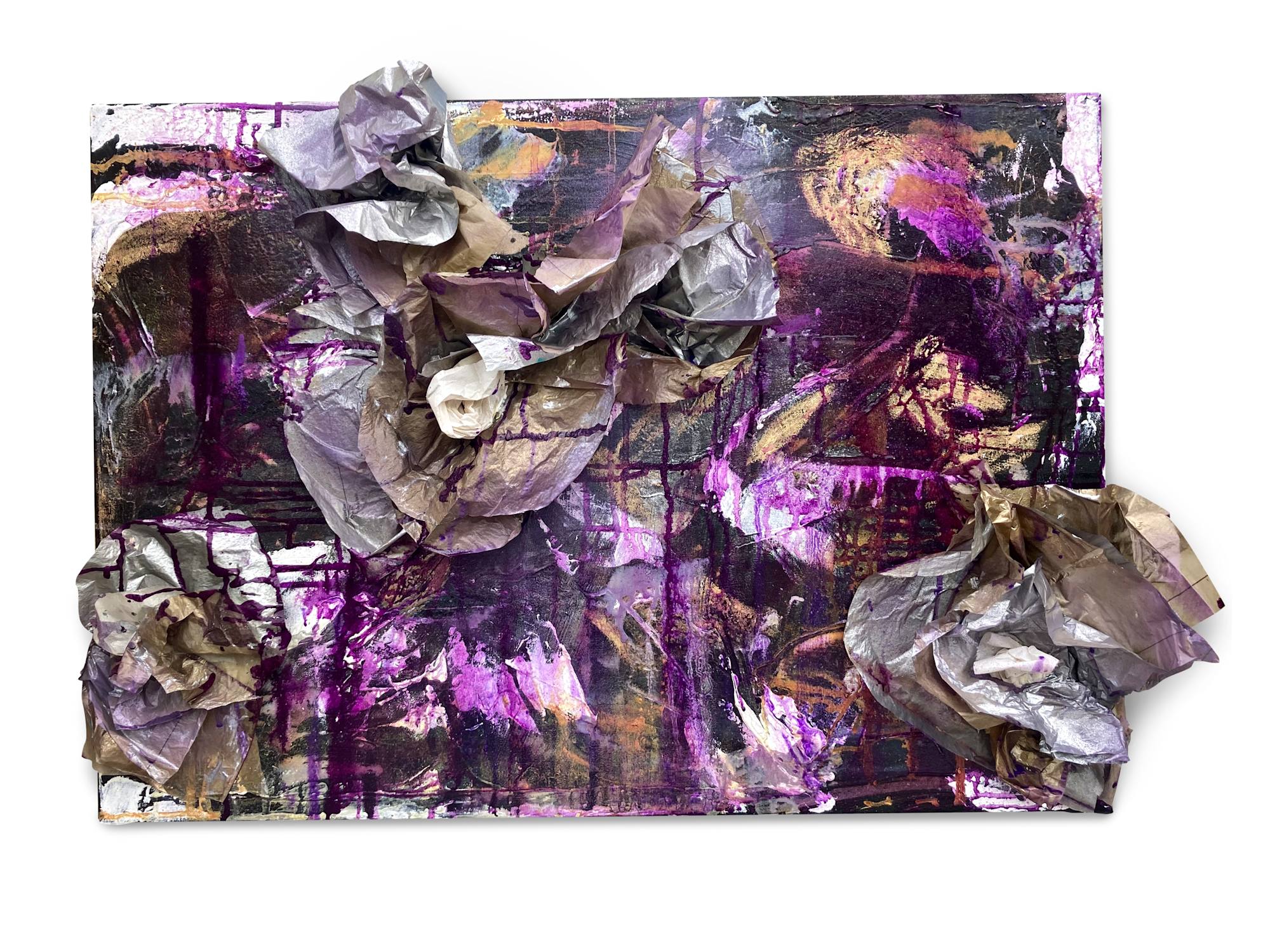 arcylic, pattern paper, oil pastel, ink, and spray paint