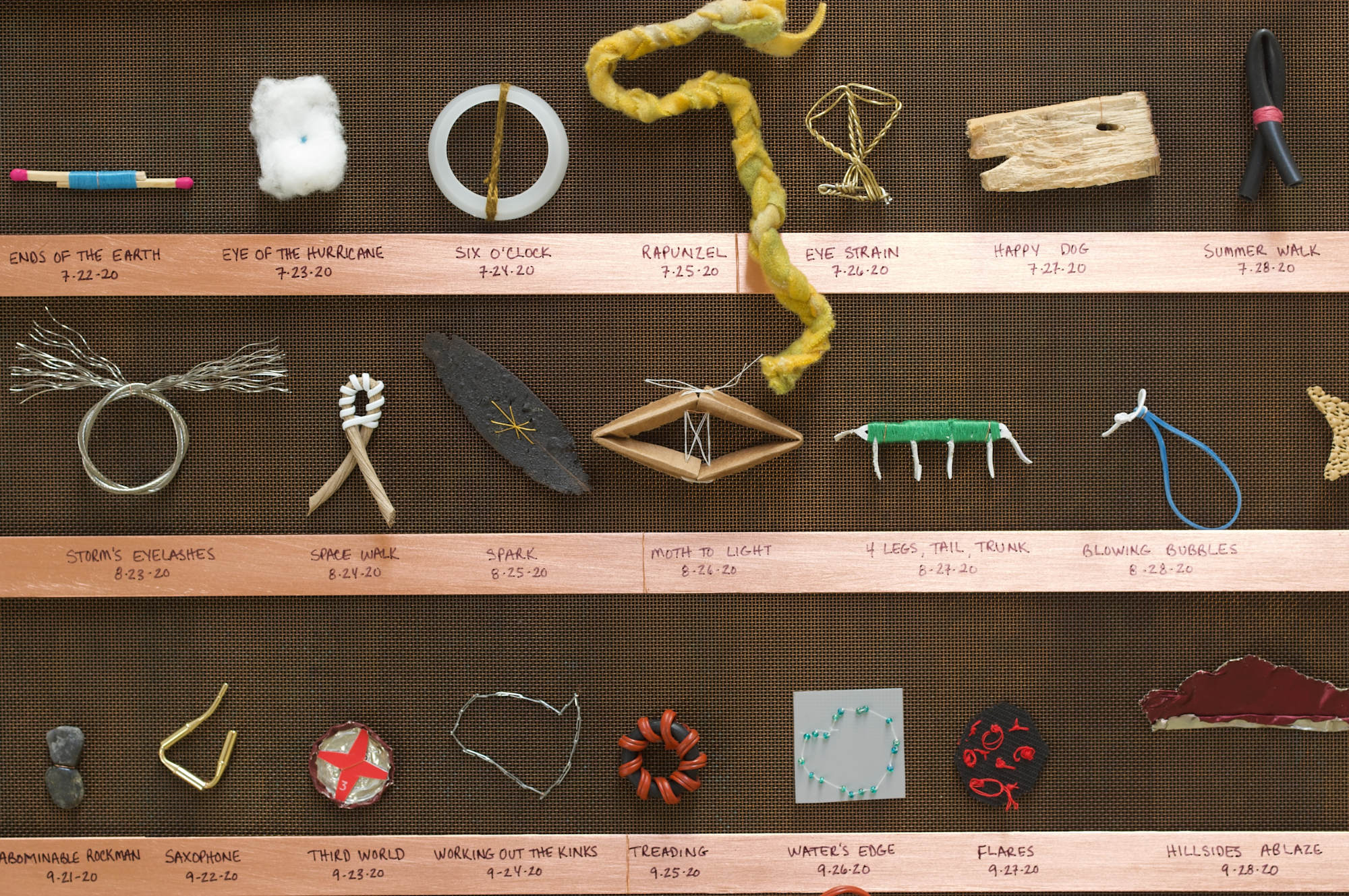Beginning on January 1, 2020 I created a small object each day for the entire year, using mundane, scavenged and re-worked materials, which resulted in 366 elements (it was a leap year). This piece documents the creation of these pieces, along with the title I gave them each day. The elements are organized chronologically; each row represents the duration of a month and each object is identified by the day of its creation, along with its title. Being that the year 2020 was the onset of Covid, this piece ends up being a product of how time slowed down, and of the compartmentalizing that occurred while we waited out the pandemic. This was not planned. I merely wanted to establish a disciplined, journalistic approach in documenting the quotidian life of an artist.