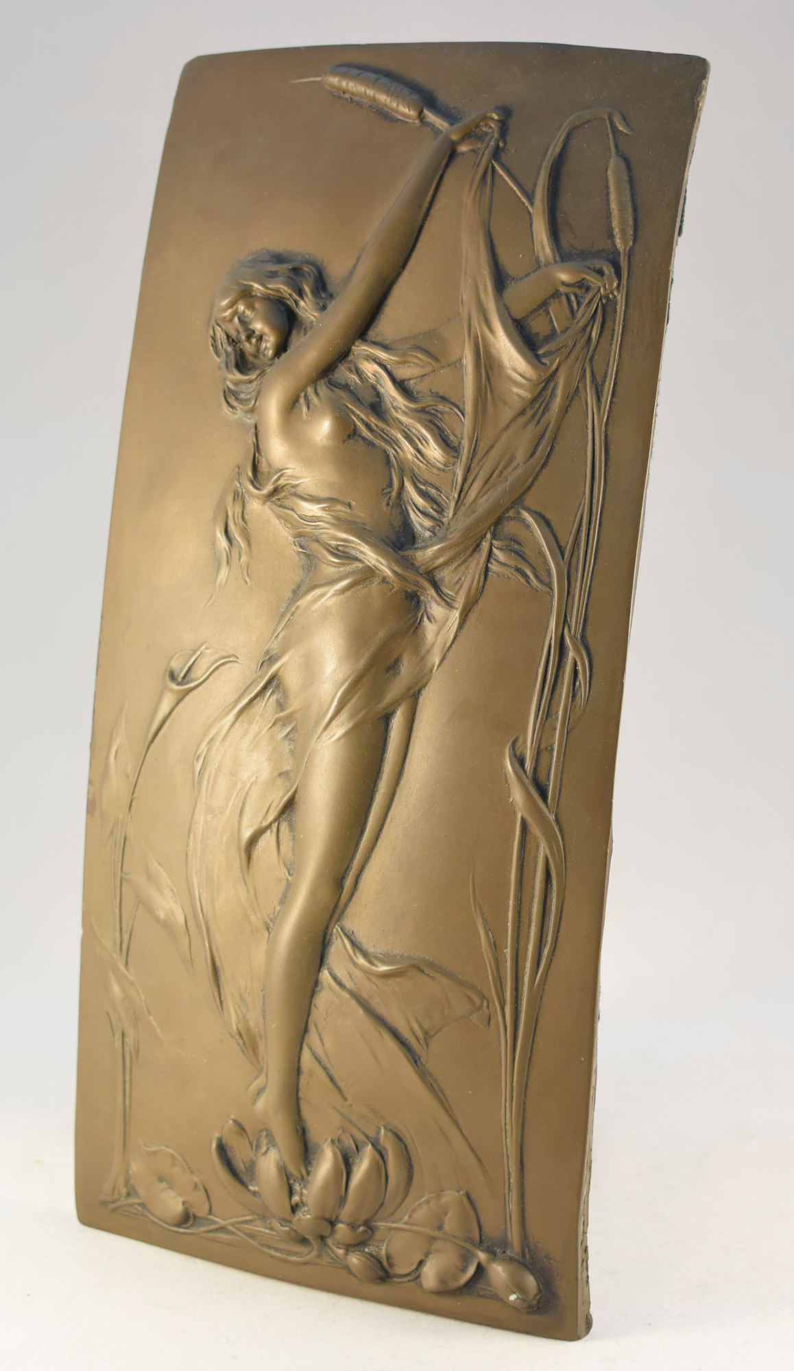 Beautiful decorative Art Nouveau plaque with nymph amidst flowers, water-lilies and bullrushes.