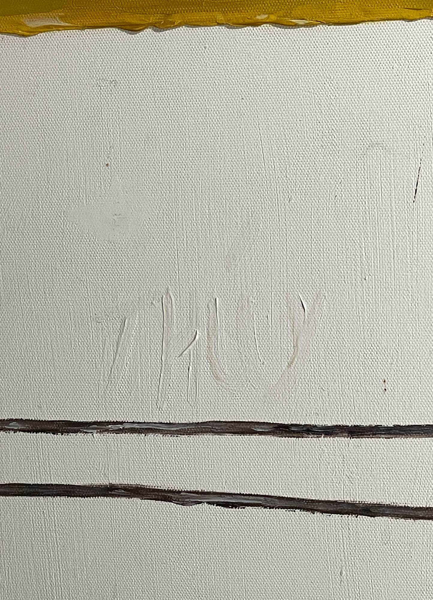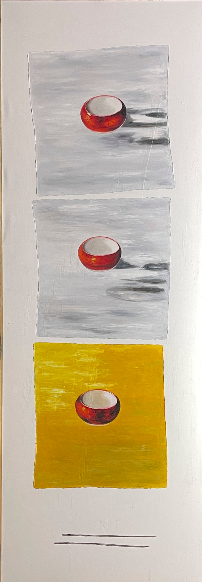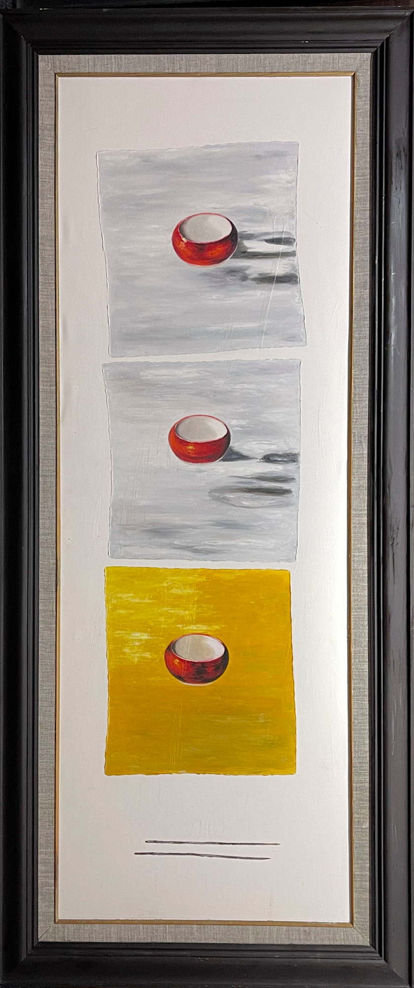 Huge piece, early example of her iconic bowls with chopsticks theme. Signed lower centre, with inscriptions on frame verso.