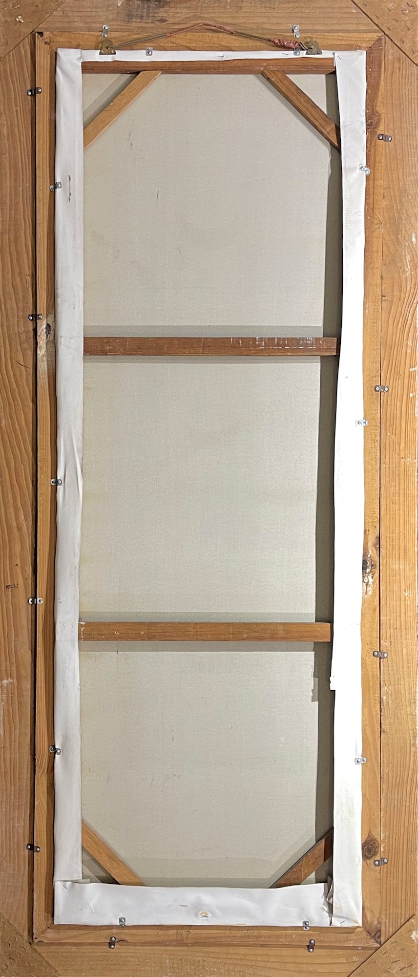 170 x 60 cm canvas with grey and gold mat and heavy black frame.
