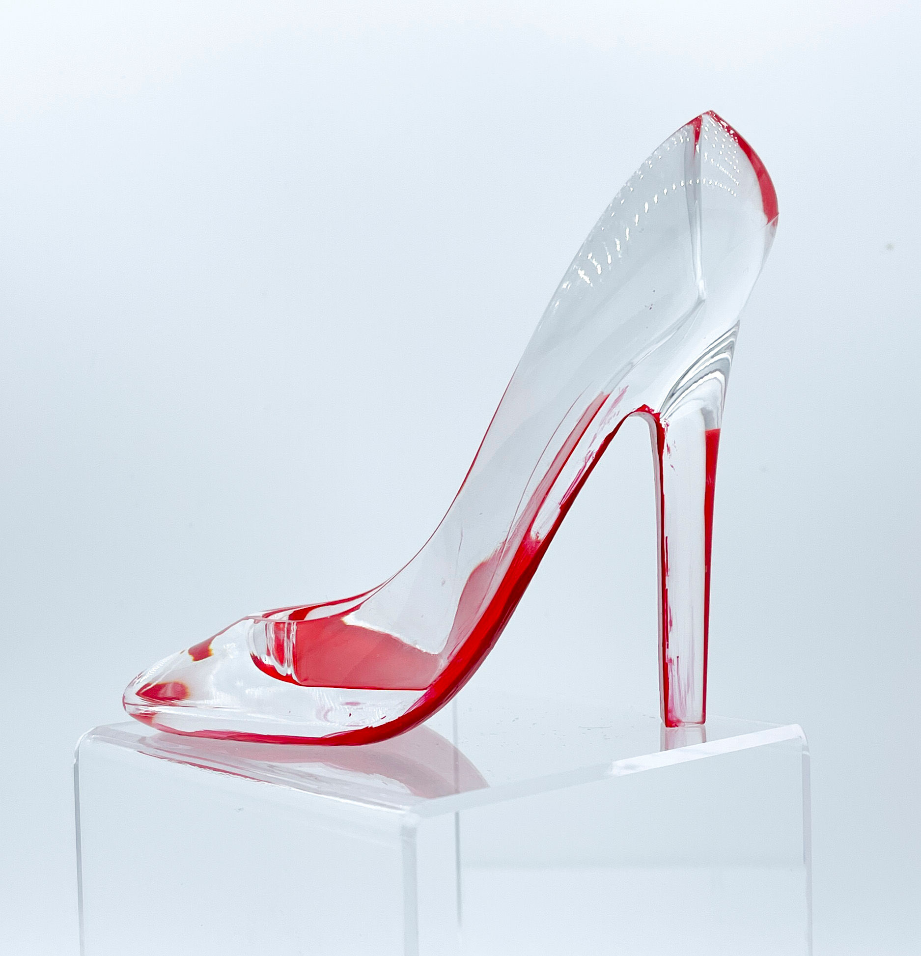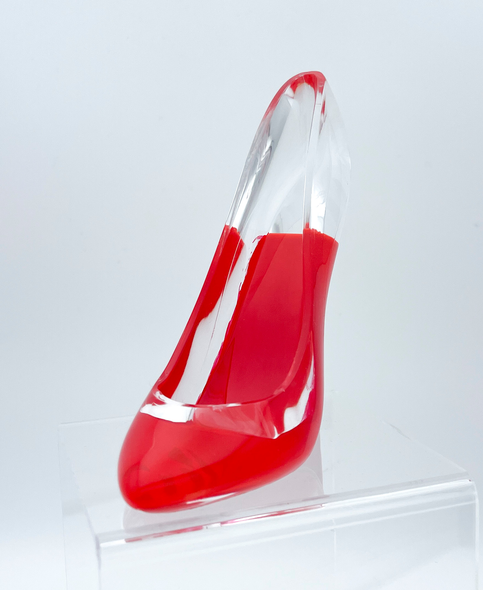 Striking acrylic sculpture with sole and heel hand painted in a remarkably glossy shade of red, incorporating KASM's signature humour and depth.