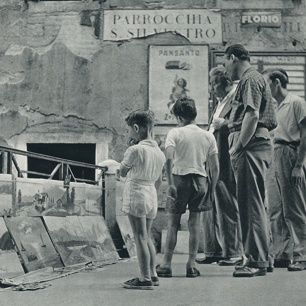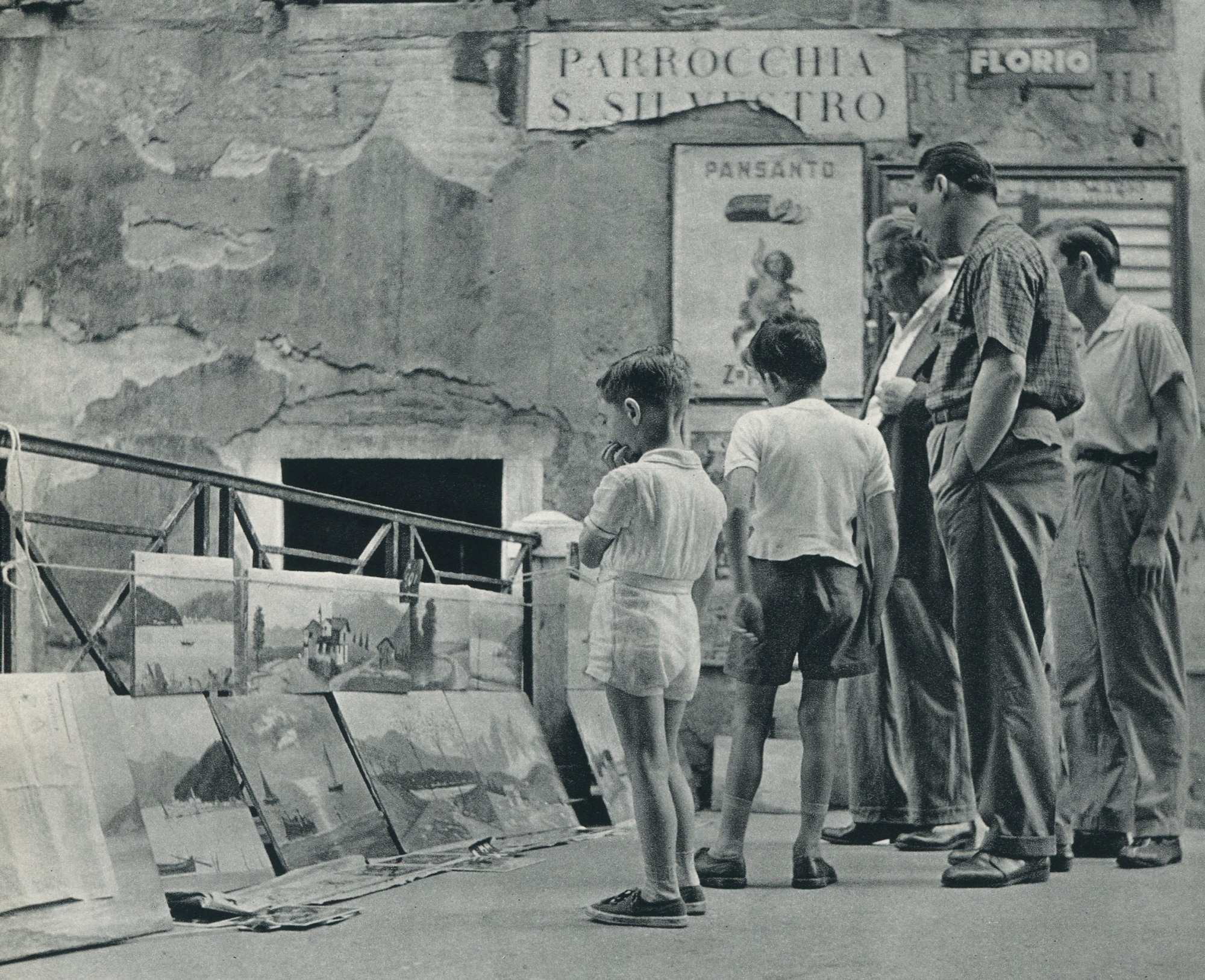 "Exhibition" is a typically engaging vintage Italian street scene from Giacobbi. A bridge by the church of St Silvestro in Motta di Livenza is where the locals have come to cast a critical eye on the displayed works. With so many masterpieces in nearby Venice, it's a tough crowd!