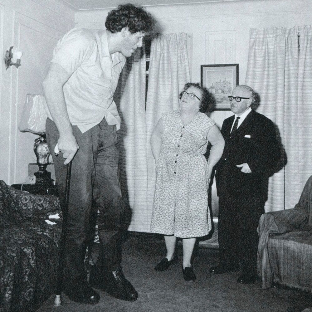 Born Oded Ha-Carmeili in Tel Aviv to American-immigrant parents, Carmel’s gigantism stemmed from acromegaly, a glandular disorder, which began to affect his growth during his teenage years. By 1970, the condition caused an extreme curvature in his spine so that he needed to use two canes in order to stand. While Arbus was initially intrigued by Carmel's abnormality, her photograph also encapsulates his humanity and the difficult reality of his familial situation. Deteriorating health forced Carmel to live with his parents, whose lives in turn were limited by the responsibility of caring for their son. The strained relationship between Carmel and his father, who did not approve of his circus work, is painfully apparent in this image.