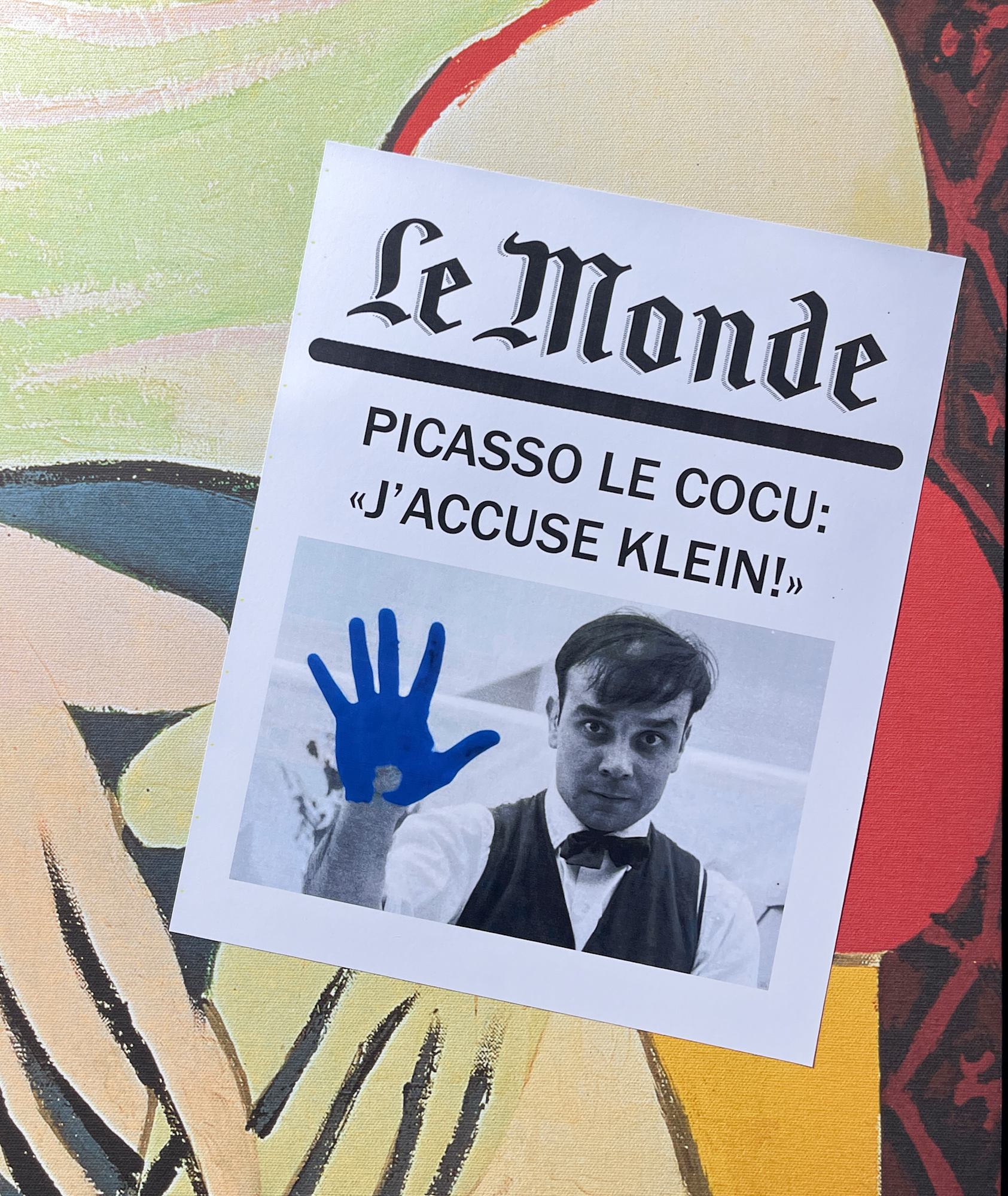 The title translates as "Dreaming of Yves" with the young muse dreaming in Klein "Blue Monochromes", seemingly after a passionate encounter with the young French master. She has dozed off reading the newspaper and the headline translates as "Picasso the cuckold: "I accuse Klein!". The evidence is clear for all to see, with Yves caught "blue handed" as it were...