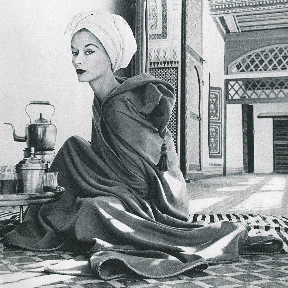 Penn described this photograph thus: "The burnous of Morocco, a cloak that is proof against heat and cold, worn everywhere by the Arabs. This Paris version, designed by Jean Dessès and flown to Morocco, was worn by Lisa Fonssagrives-Penn at La Bahia Palace in Marrakech. On the low table, a pot of mint tea,"