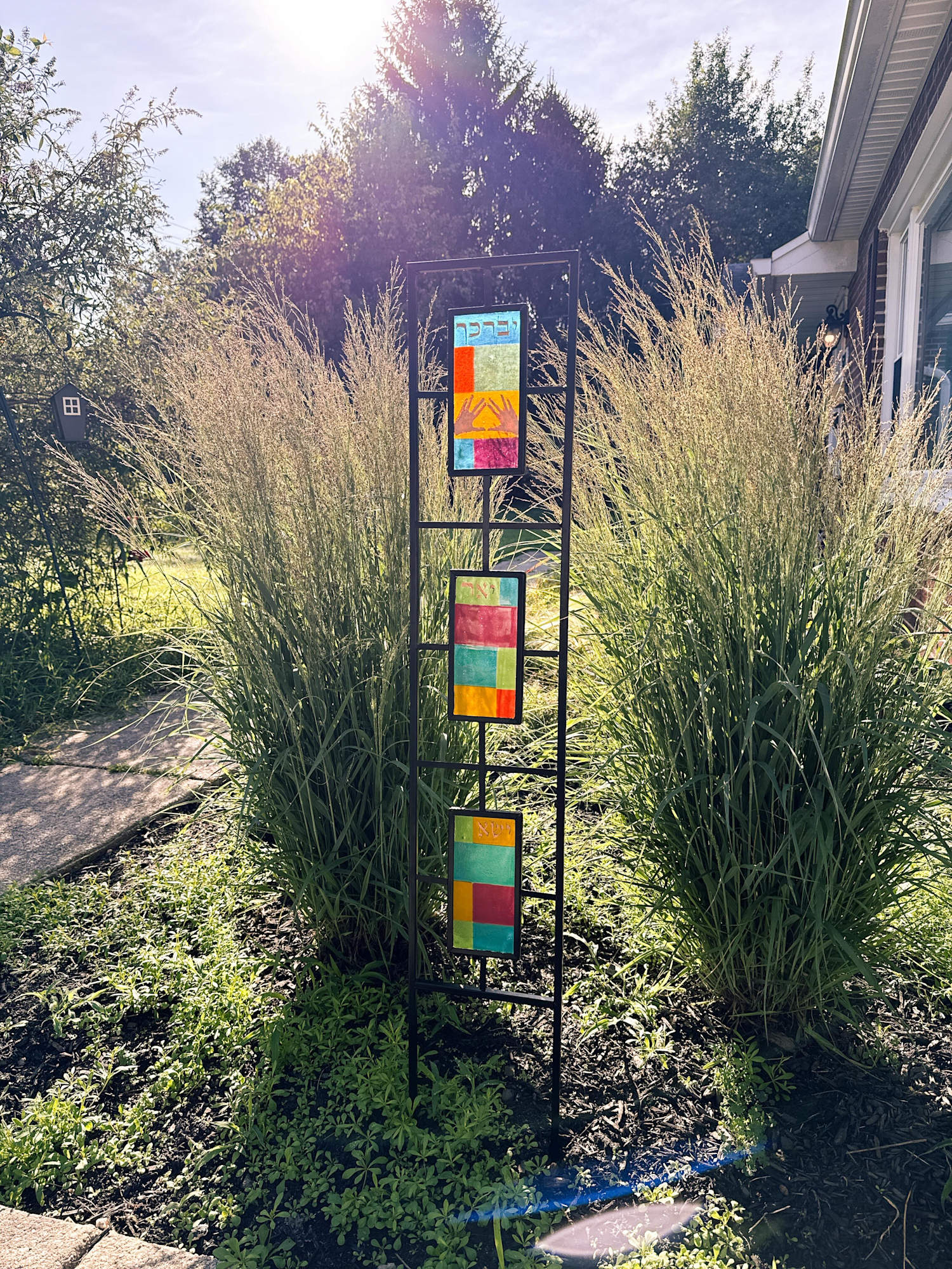 A garden trellis with three glass panels, designed to add color and interest to your garden. This trellis is customized to honor your children and grandchildren. The graphic and lettering on the panels refer to the same blessing (Birchat Kohanim) that is recited on Friday evenings for the children.