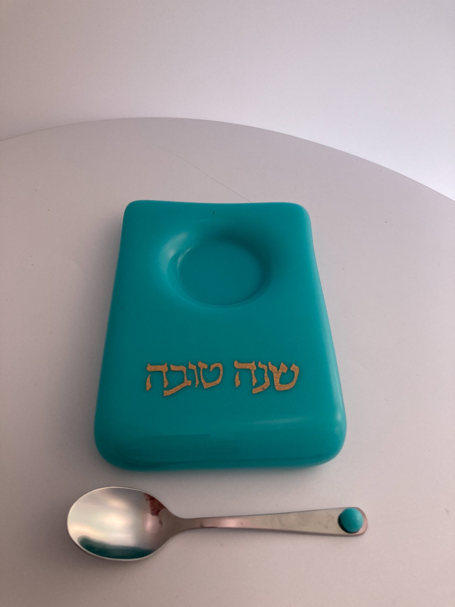 Teal fused glass honey dish with round honey well and companion spoon makes this dish a lovely addition to your holiday table.