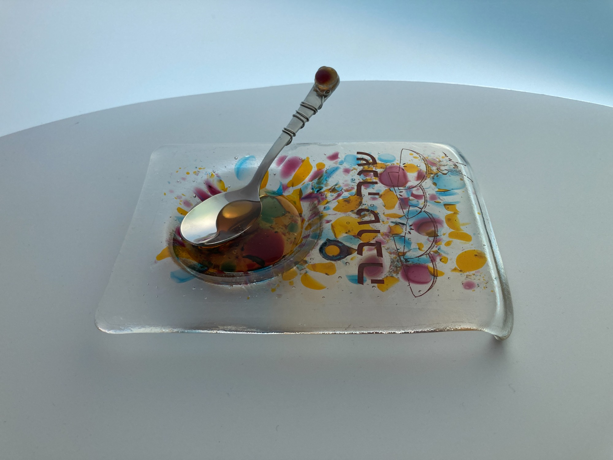 Multi-color transparent glass honey dish with round honey well and companion wire-wrapped spoon makes this dish a lovely addition to your holiday table.