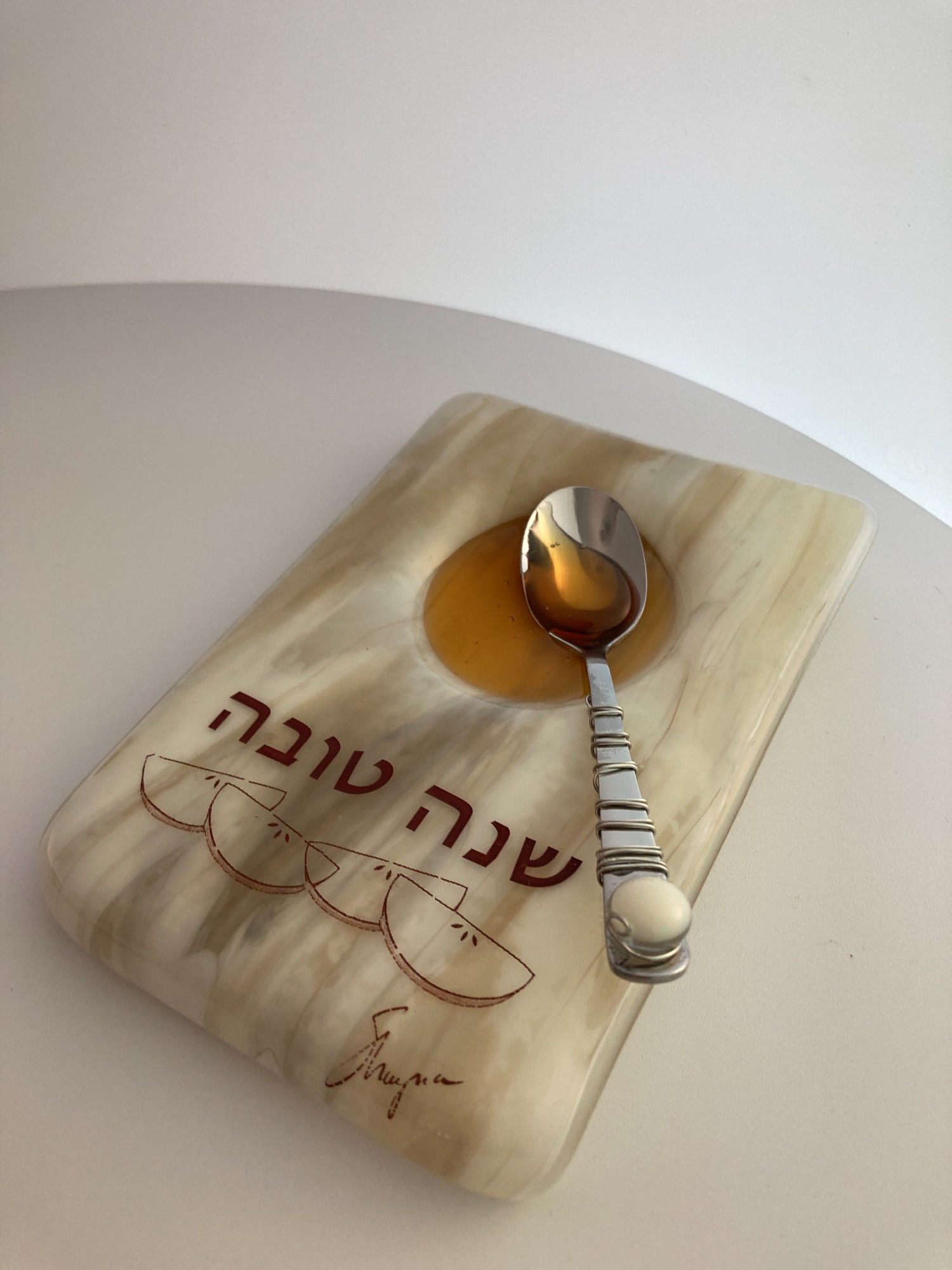 Streaky cream fused glass honey dish with round honey well and companion wire-wrapped spoon makes this dish a lovely addition to your holiday table.