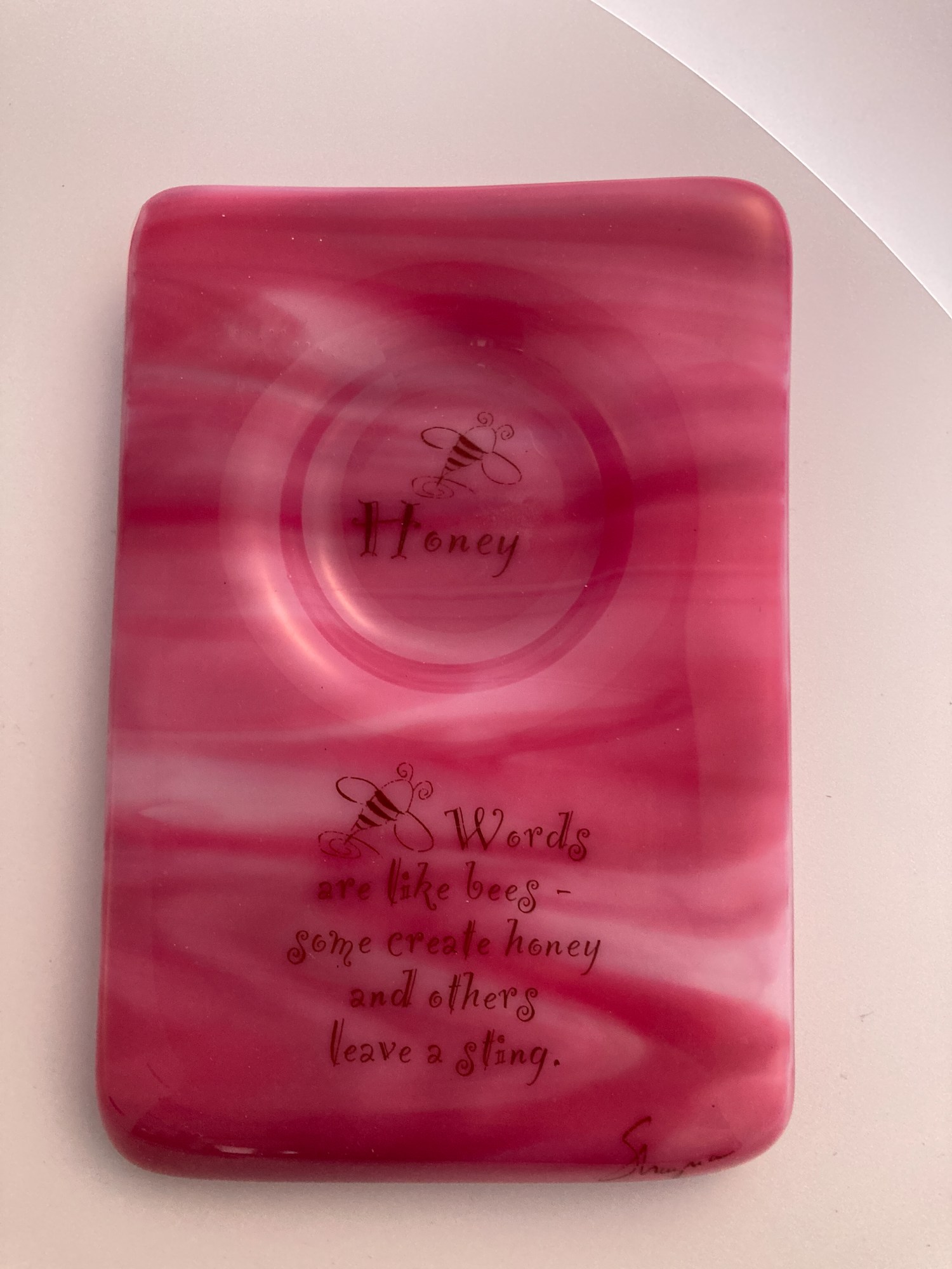 "Words are like bees - some create honey and others have a sting." A thoughtful quote on this streaky pink glass honey dish with round honey well and companion wire-wrapped spoon makes this dish a lovely addition to your holiday table.