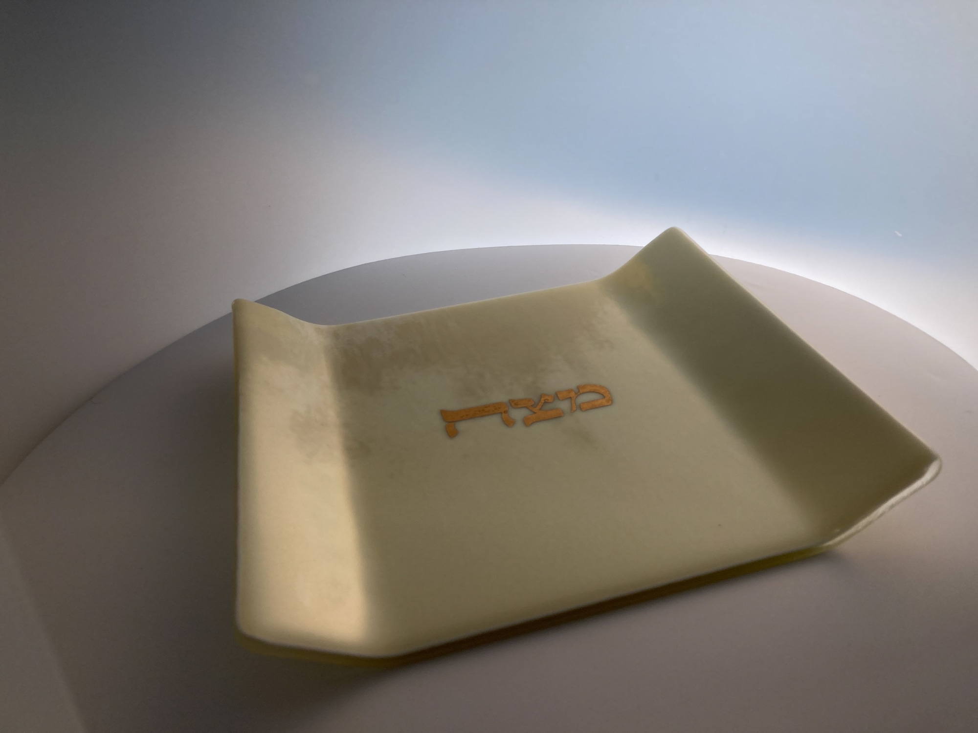 Gold-lettered Matzah plate in French Vanilla fused glass. Gentle slopes on either side leave an 8x10" flat center surface.