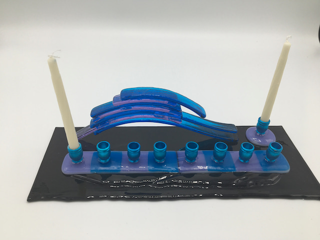 Blue and violet on black. Flowing edges menorah with layered arch.