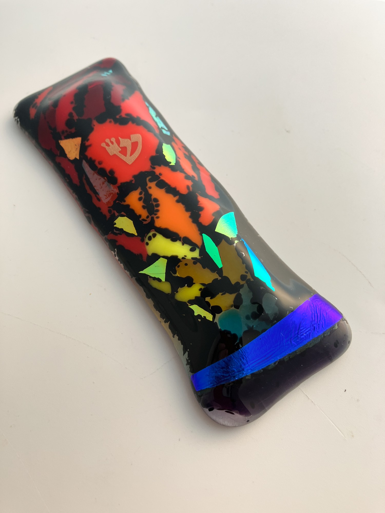 Dichro and opal glass bits with black frit foe veins adorn this glass mezuzah case. Klaf not included.