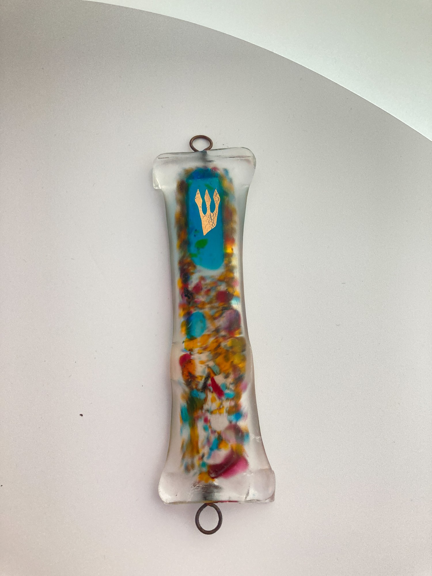 Multicolor translucent glass mezuza with gold letter Shin. Copper wire twists, top and bottom, to attach to your doorpost. Klaf not included.