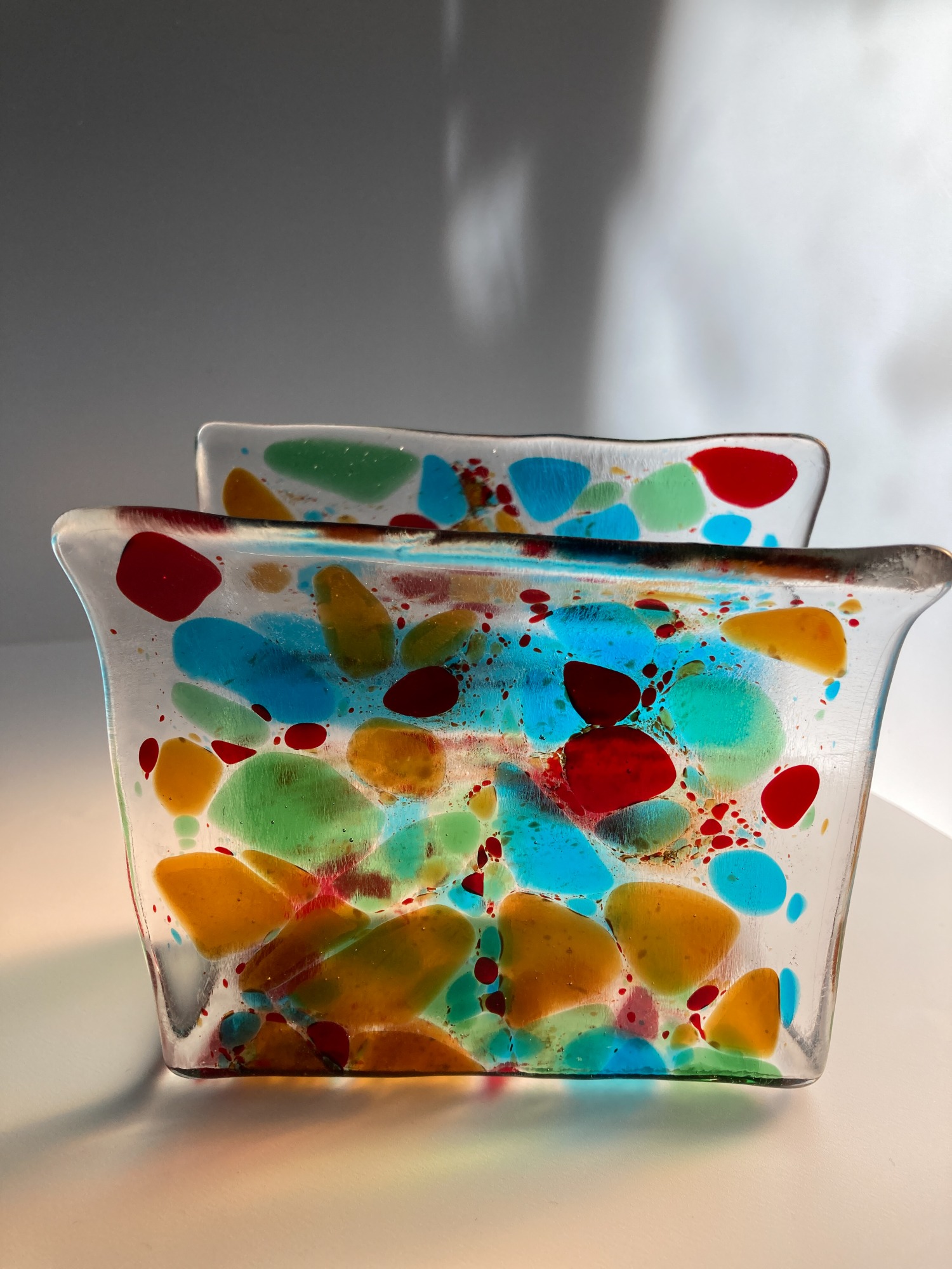 This colorful napkin holder can be used to hold mail, napkins or even benchers.