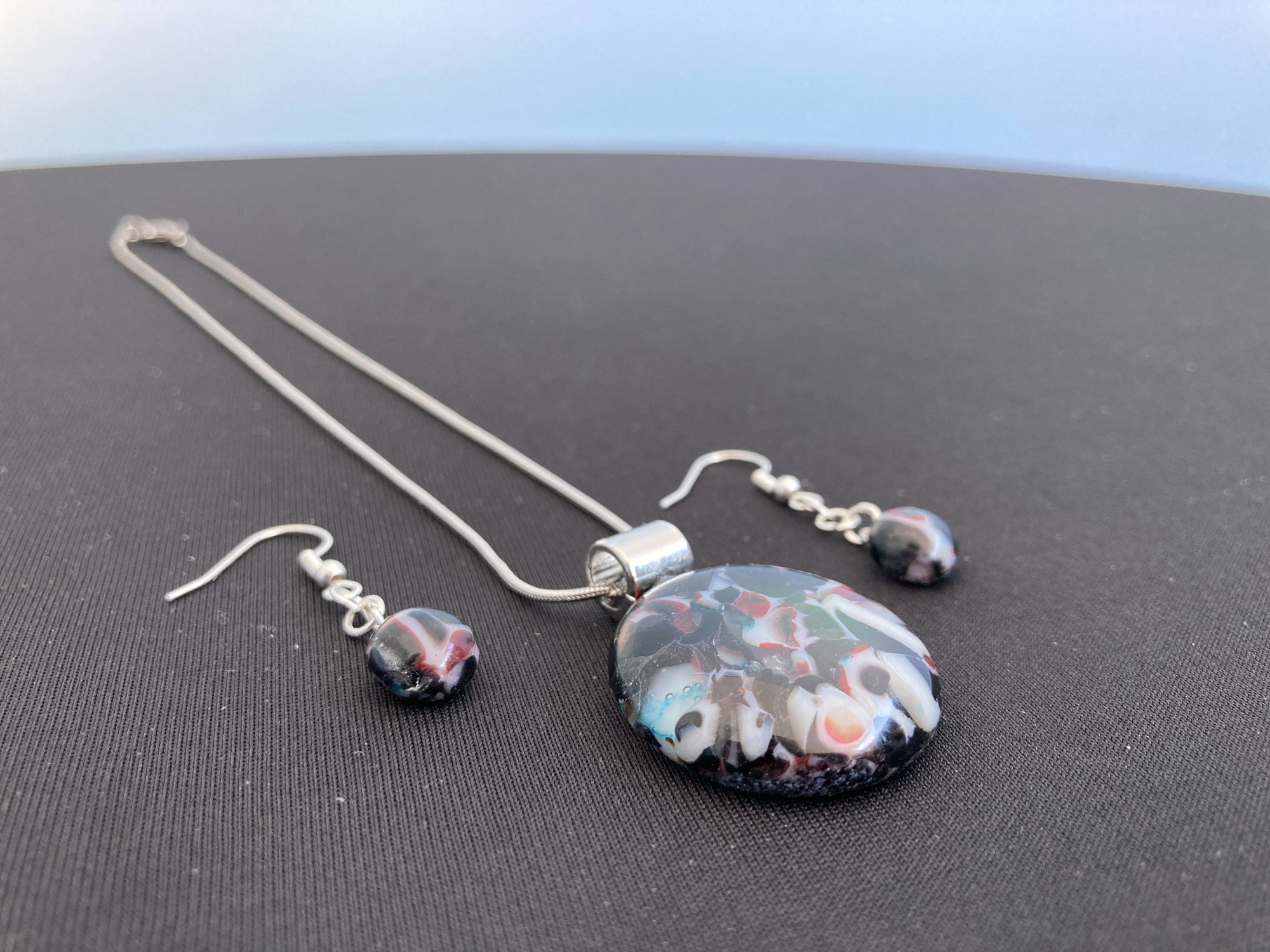 Almost marble! Black, wine and cream glass mix in a 1" round pendant with matching drop earrings. 16" chain.