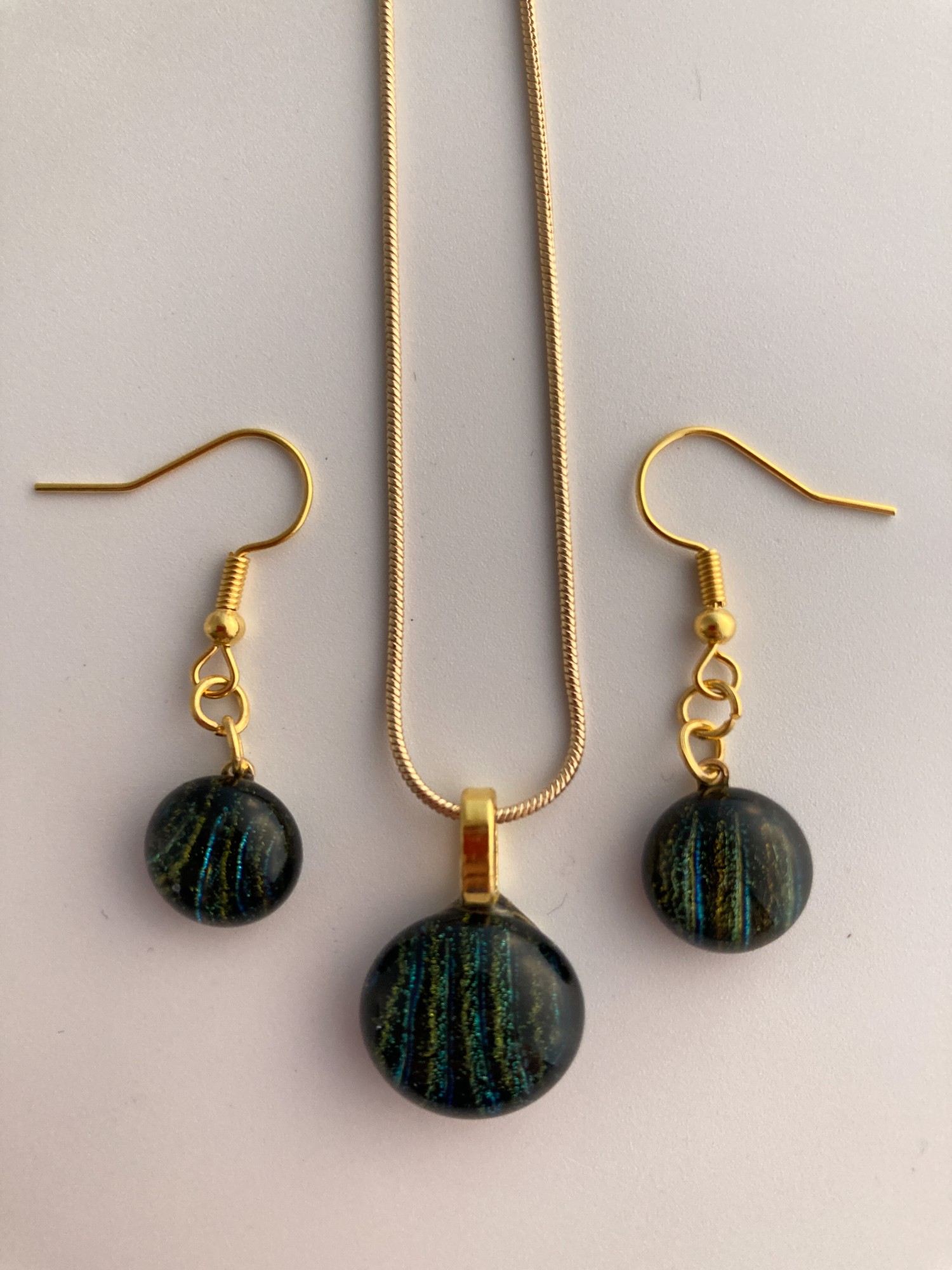 Green dichroic stripes sparkle on black ball pendant and earring set. Ear wires and gold plated chain.