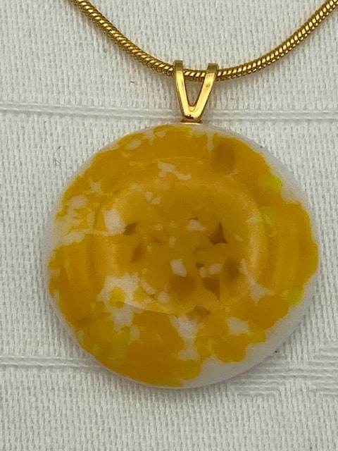 Pendant and earring set. Hanging pierced earrings. Yellow and white blended glass in gold plate setting. 16" chain.