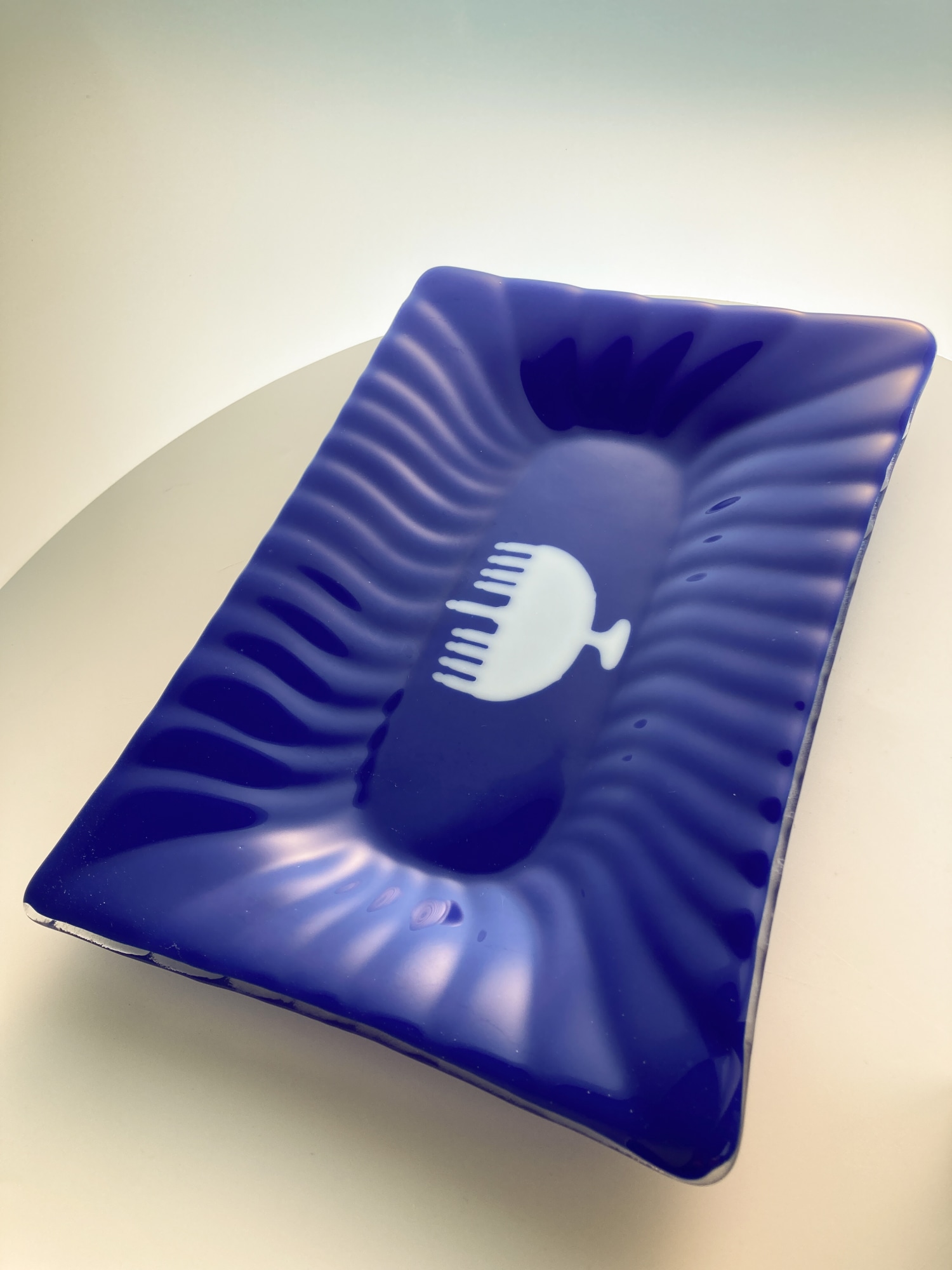 Cobalt blue glass fluted serving dish with white menorah graphic. Perfect for sering those latkes or sufganiot for Chanukah this year.