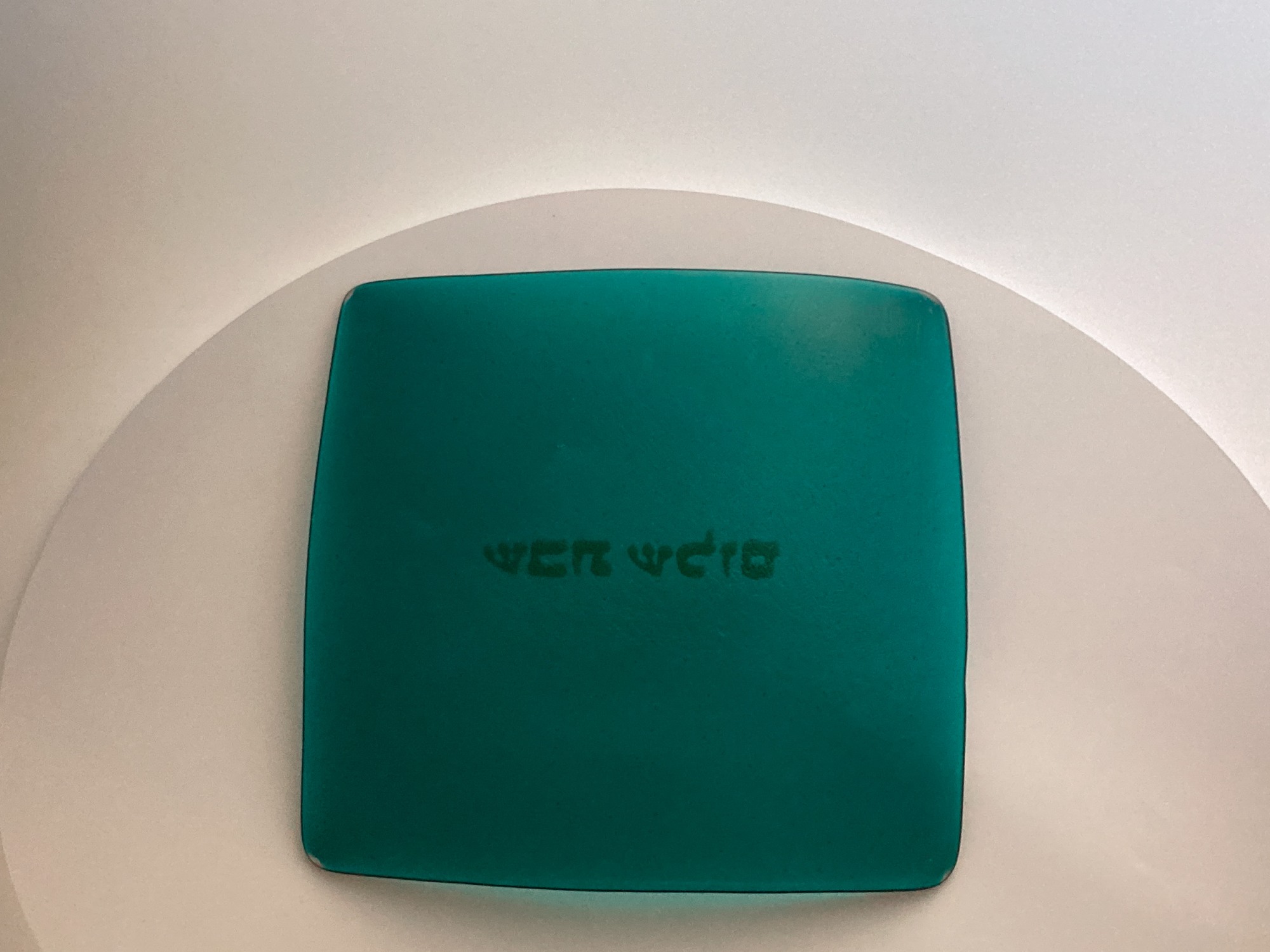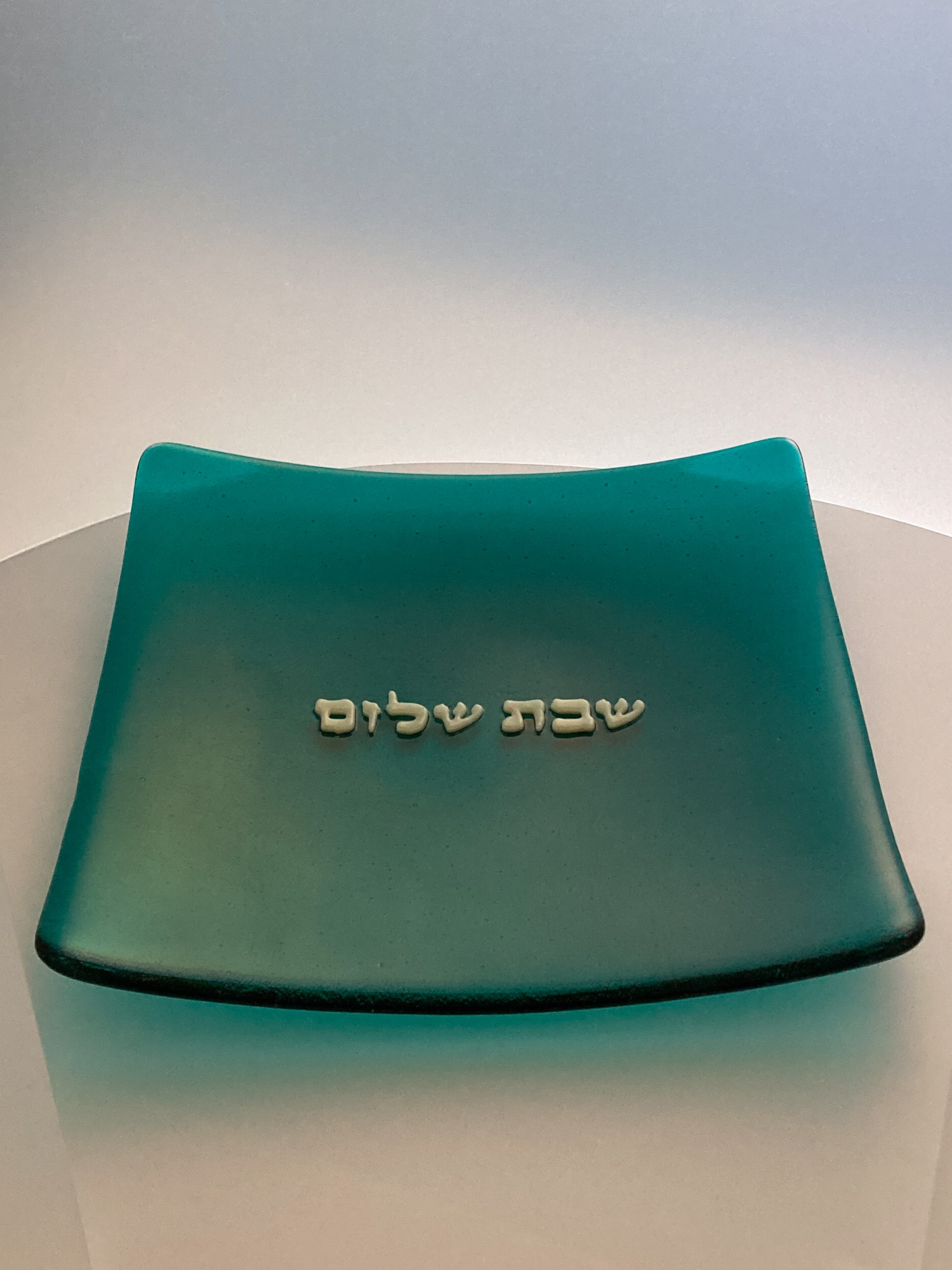 A striking Shabbat Shalom serving dish in transparent peacock blue glass with raised Hebrew lettering in rich french vanilla glass.