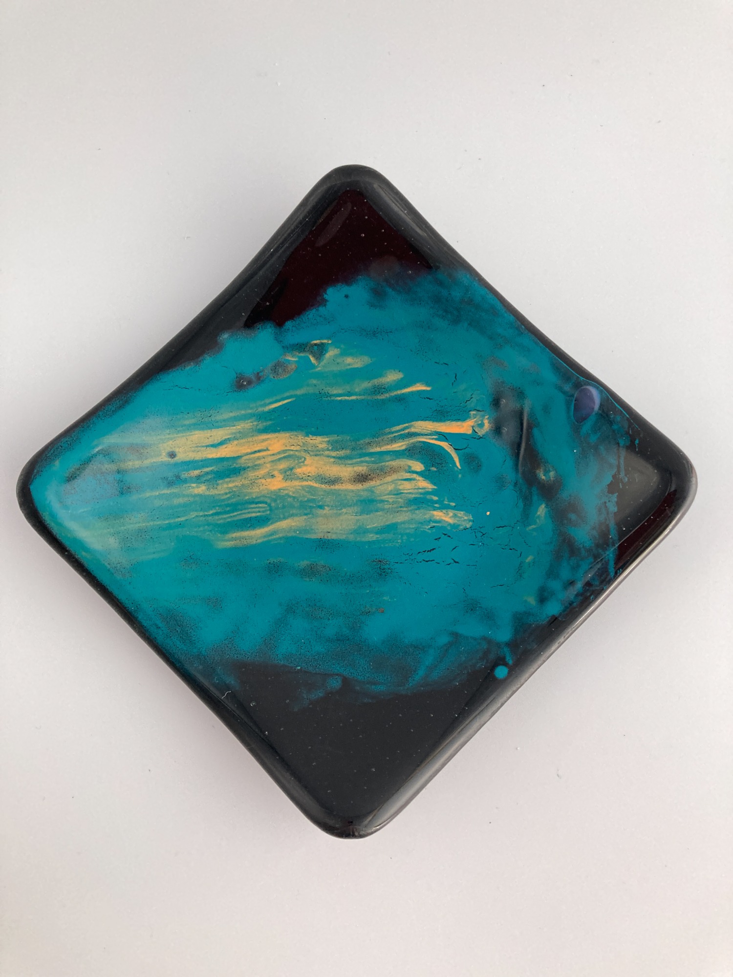 Curved plate with swirl of blue and marigold on black glass. Great for use as coasters or keys and jewelry plates.