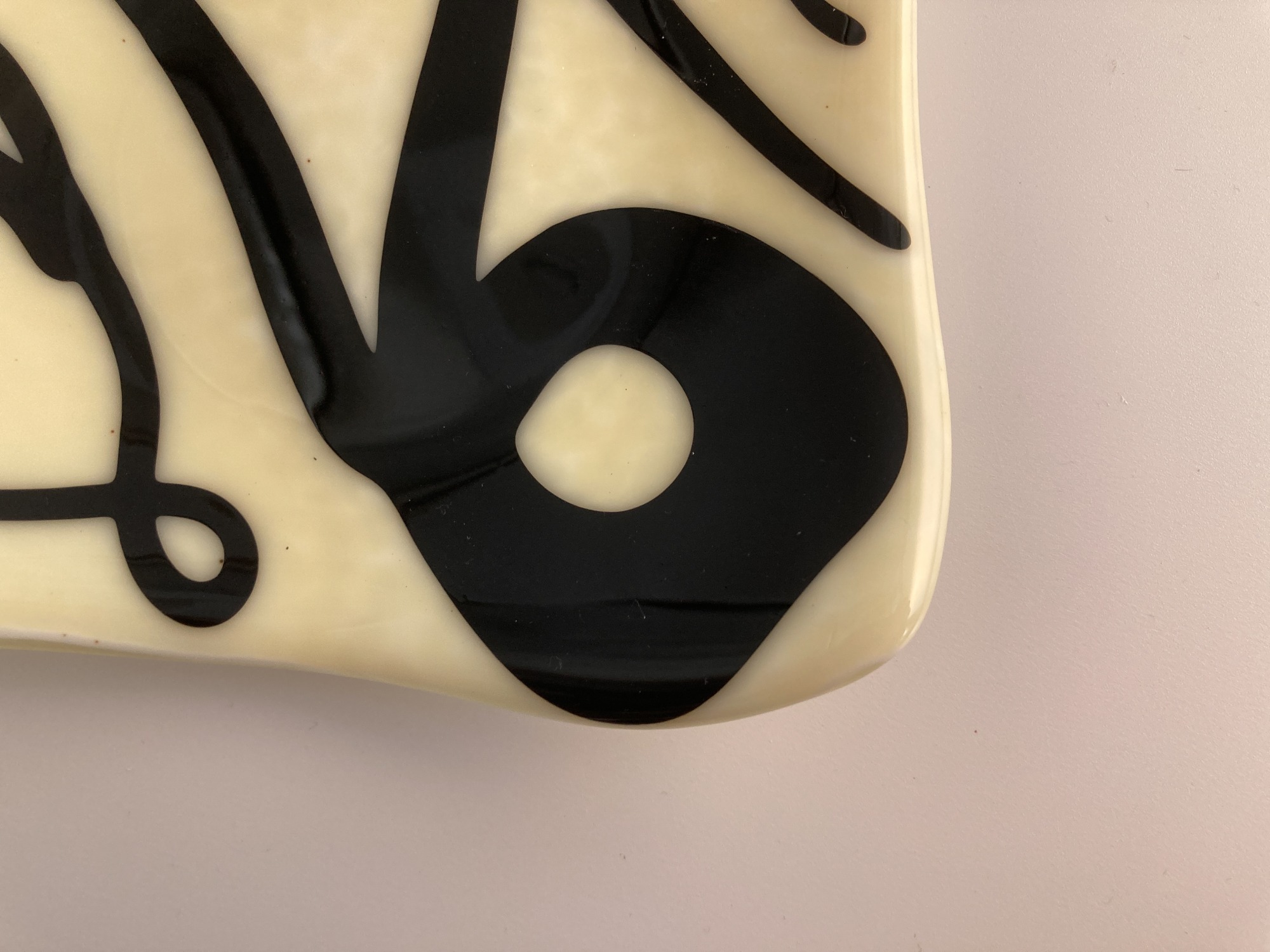 Abstract swirly black vitro glass swims in cream in this 5" dish. Matching bowl #0257 and serving platter #0391 set a mesmerizing table.