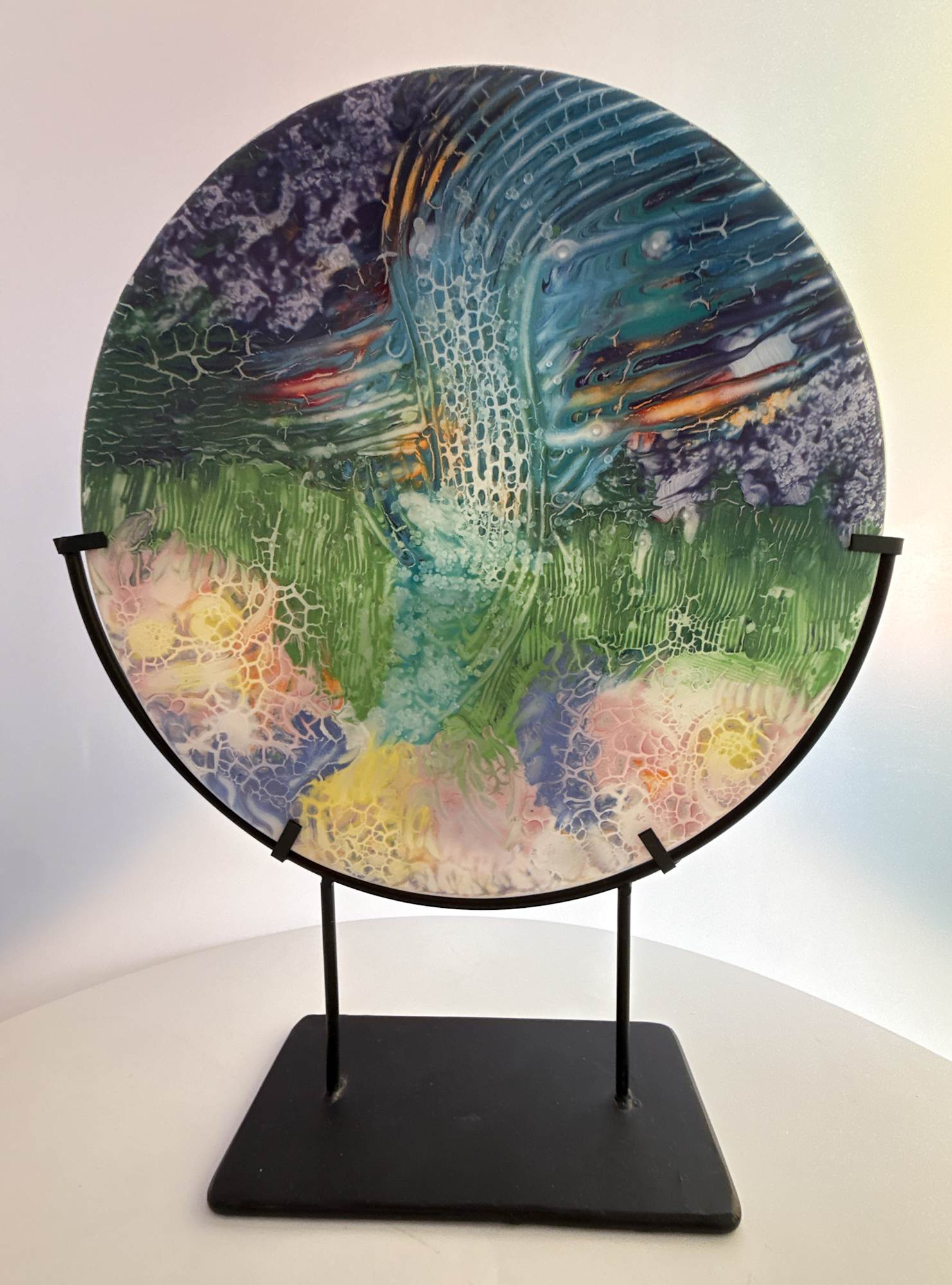 Spring Bloom, an abstract glass painting, captures the optimism of nature’s transition from stormy purple skies to vibrant spring greens, yellows, and pinks. The abstract nature of the piece encourages viewers to reflect on their own interpretations and emotions evoked by the colors and forms. The organic, flowing patterns, are an artistic reflection of natural elements like landscapes, water bodies and flowers.