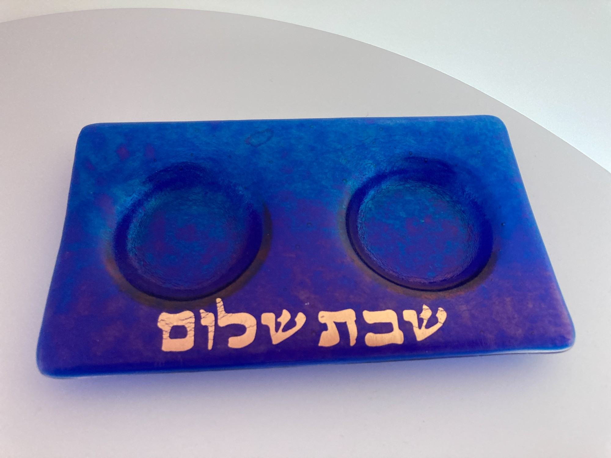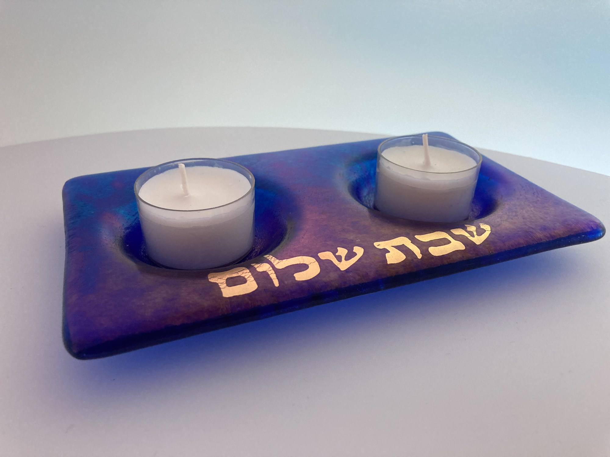 Shabbat Shalom tea light holder. Royal blue glass compliments the shimmering gold lettering. A lovely lighting set up for your guest or just for you.