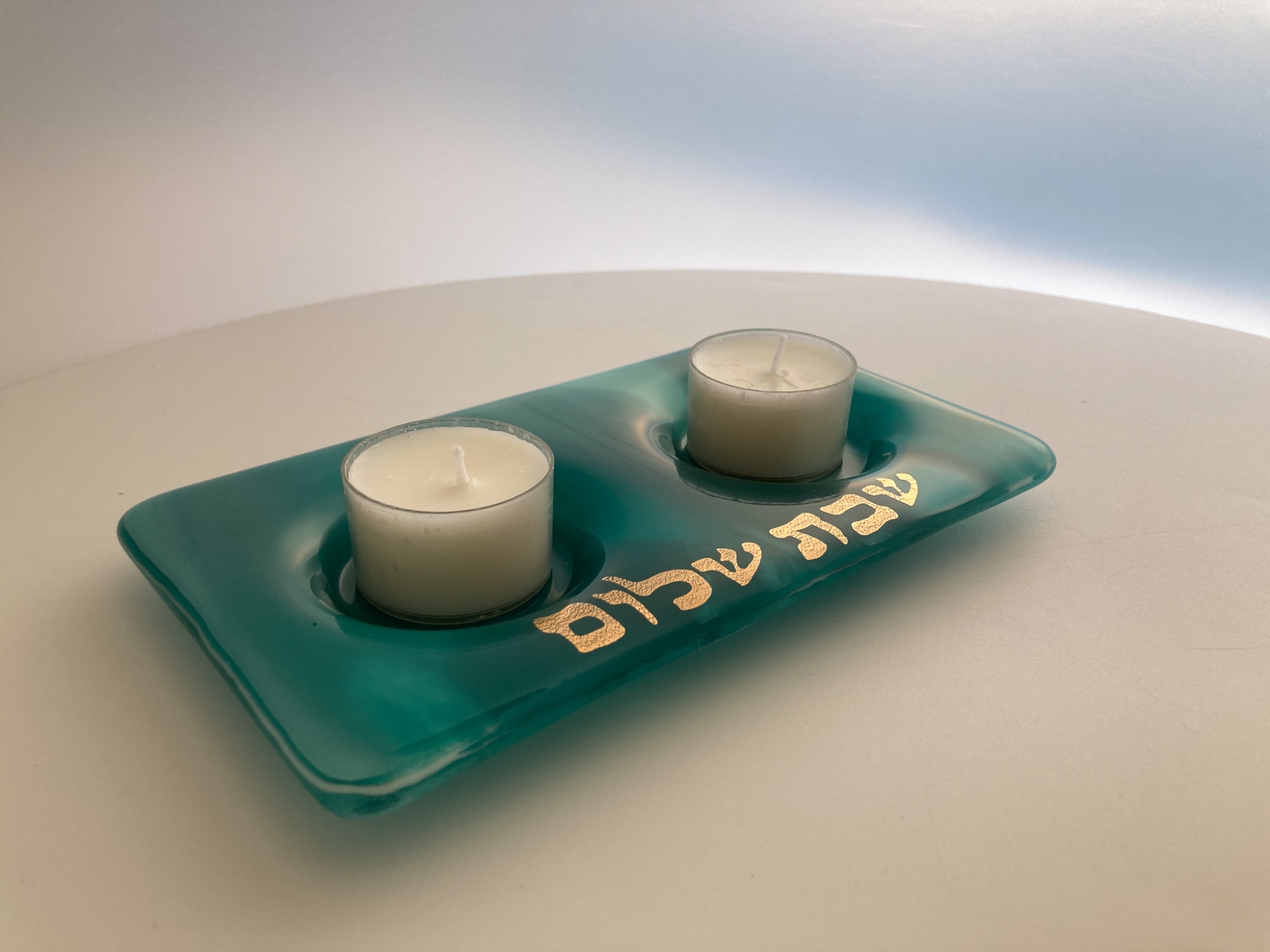 Streaky peacock blue and white tea light holder with Shabbat Shalom in gold Hebrew lettering. Perfect for travel, for guests or for a hostess gift. Coordinates with match plate #1452