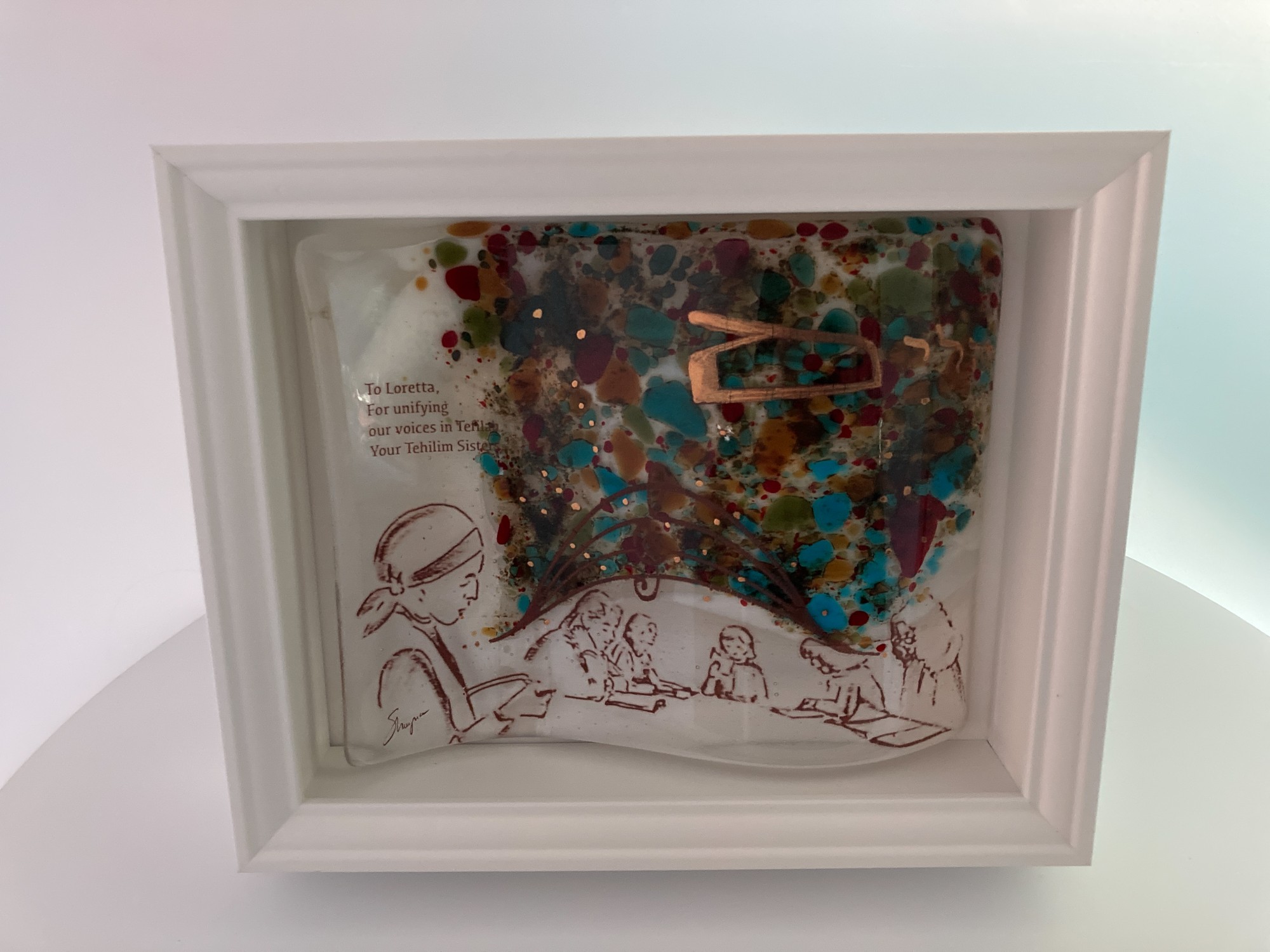 This award was designed as a thank you to our community leader and organizer of the women's Tehillim group. The book of Tehilim represents a range of voices in prayer and supplication and when we get together to recite them our prayers form a stronger, more powerful unified voice. Art glass mounted in a 9 x 11 x 2.25" shadow box with LED lights.