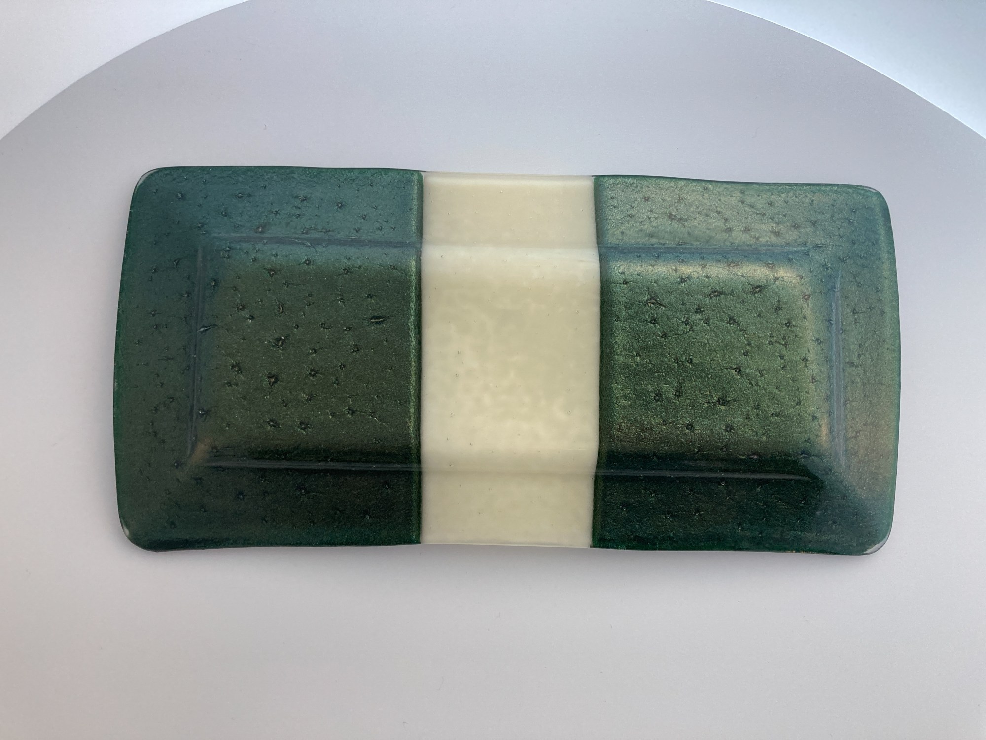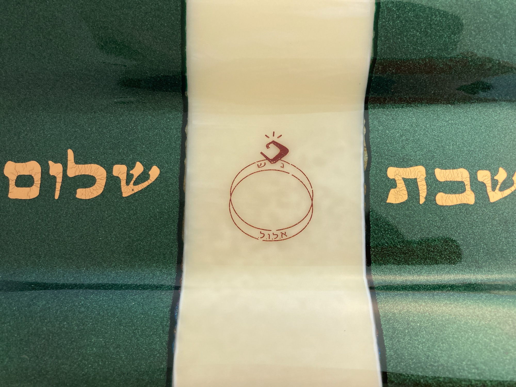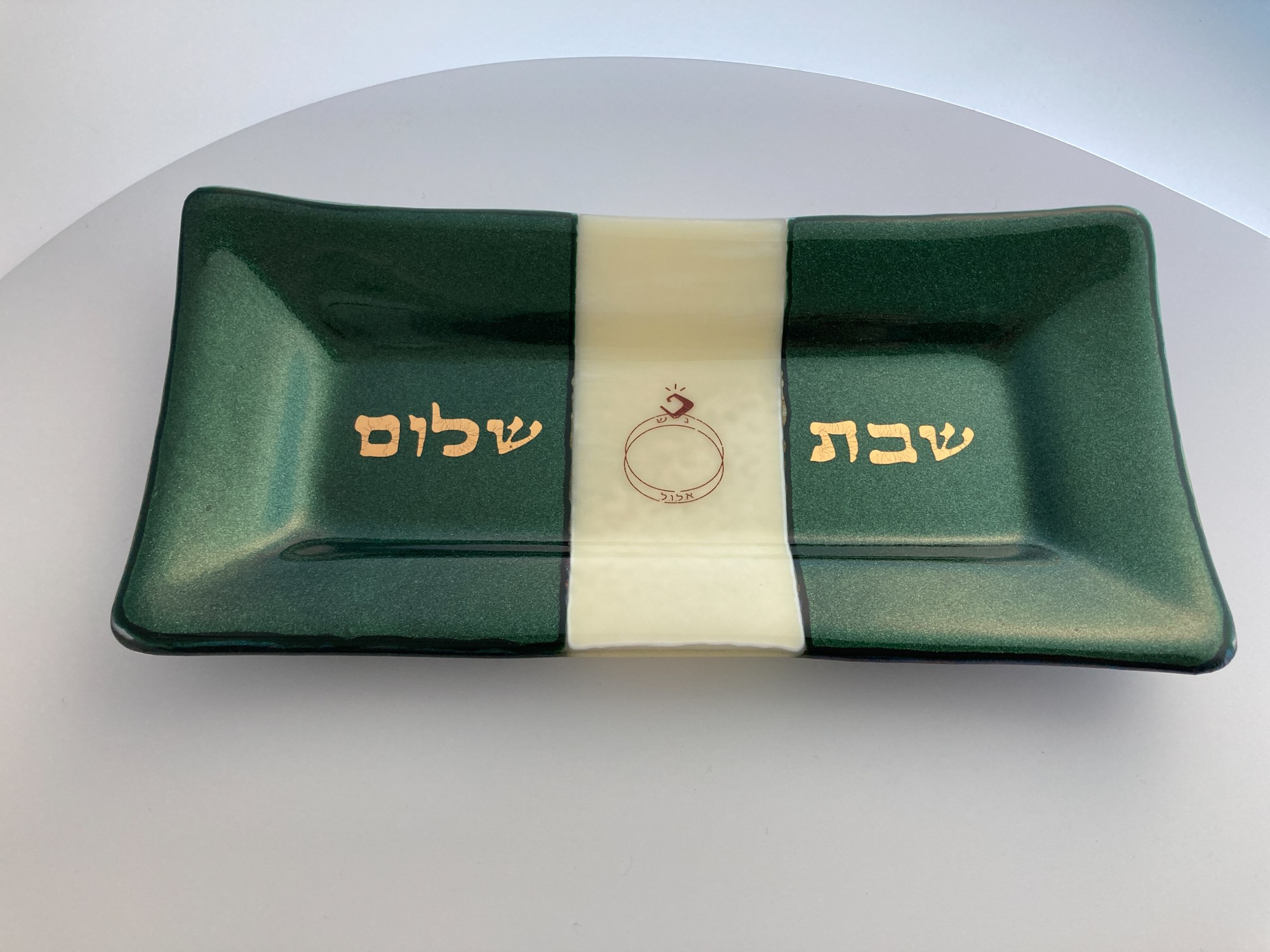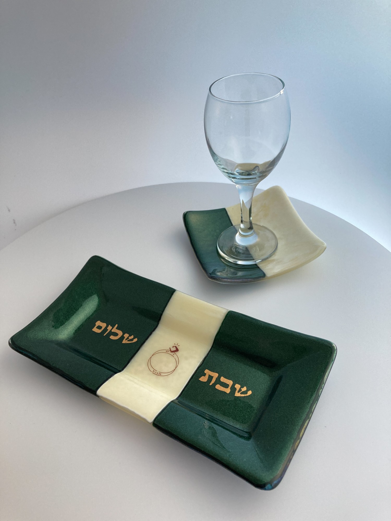 Golden Shabbat Shalom (in Hebrew) on iridescent green glass and wedding logo on cream glass center. Coordinates with 5" dish/wine coaster #0530.