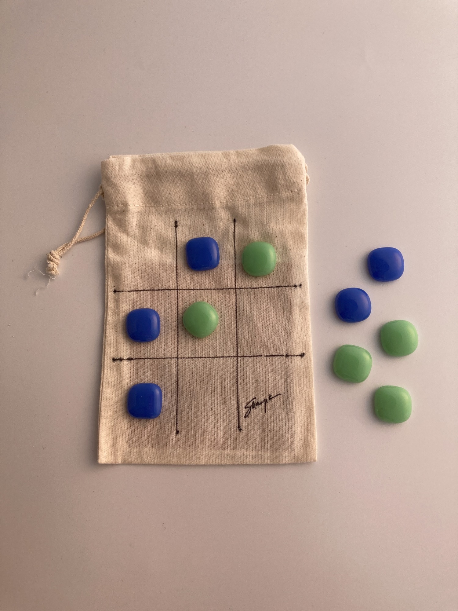 Tic Tac Toe in-a-bag is a delightful gift for young and old to enjoy, at home or on the road. Spring green and sky blue.