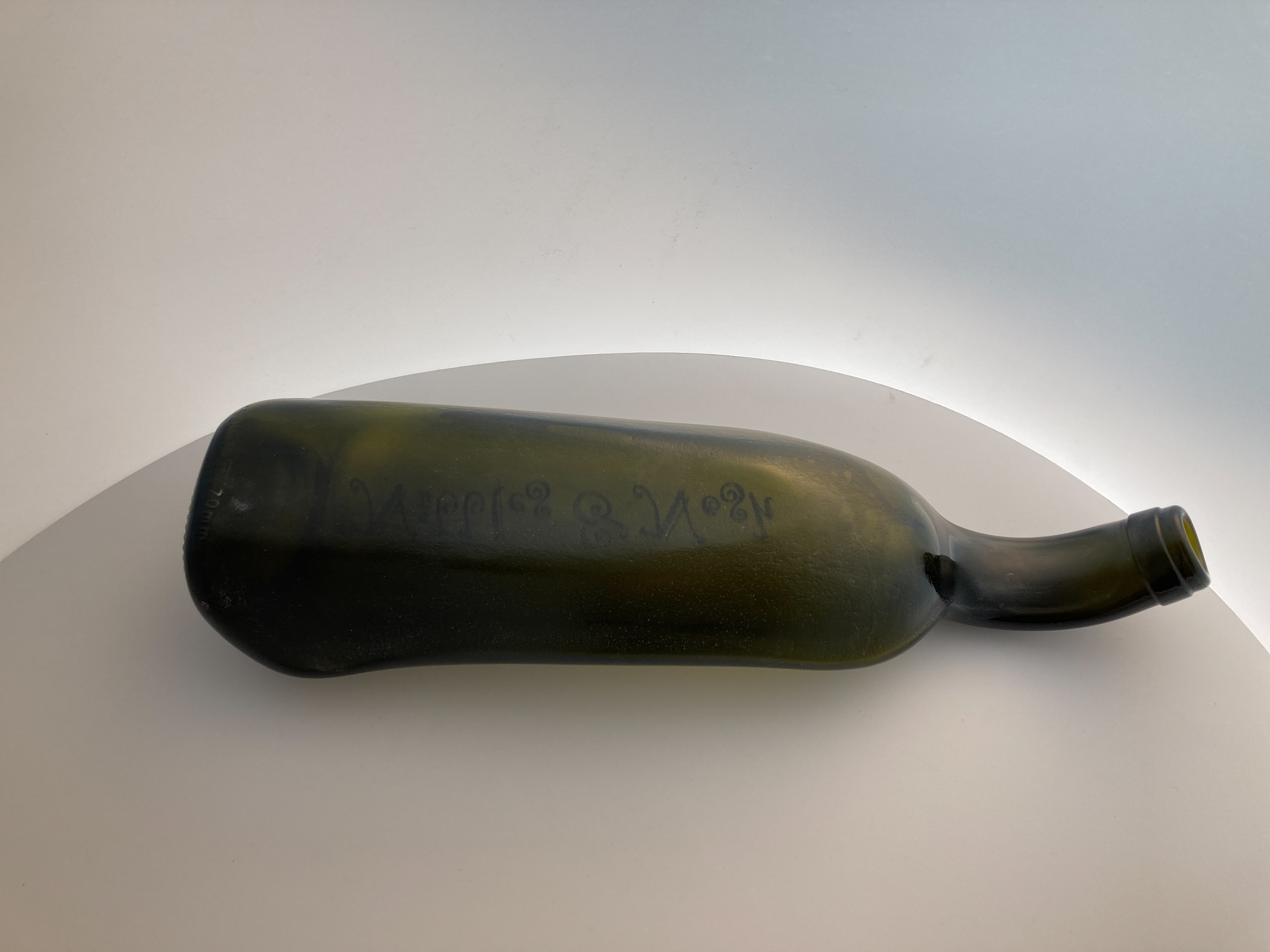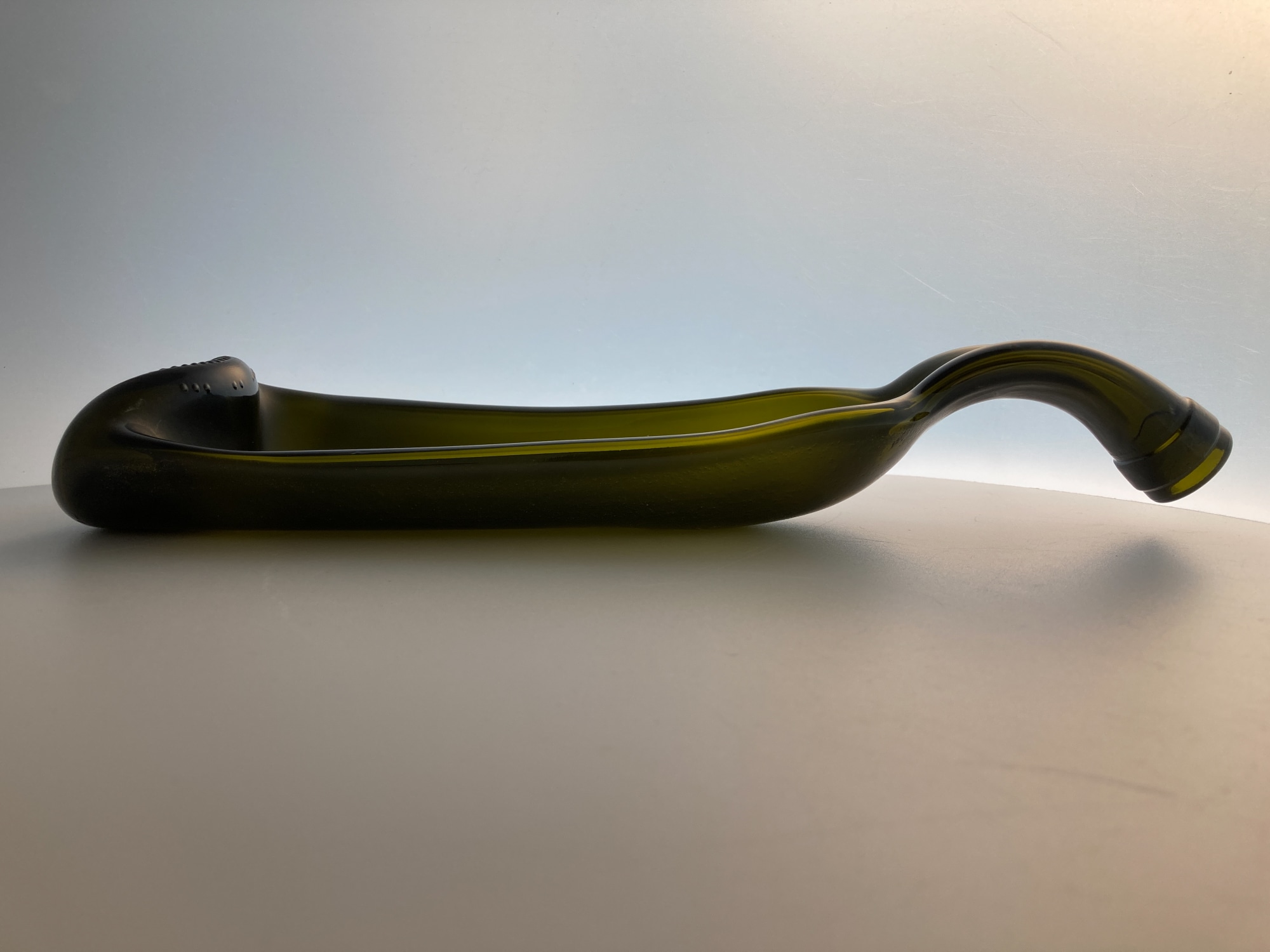 Engraved "Nibbles & Nosh" serving dish upcycled from brown wine bottle. Single bowl with swan neck. 12" length.