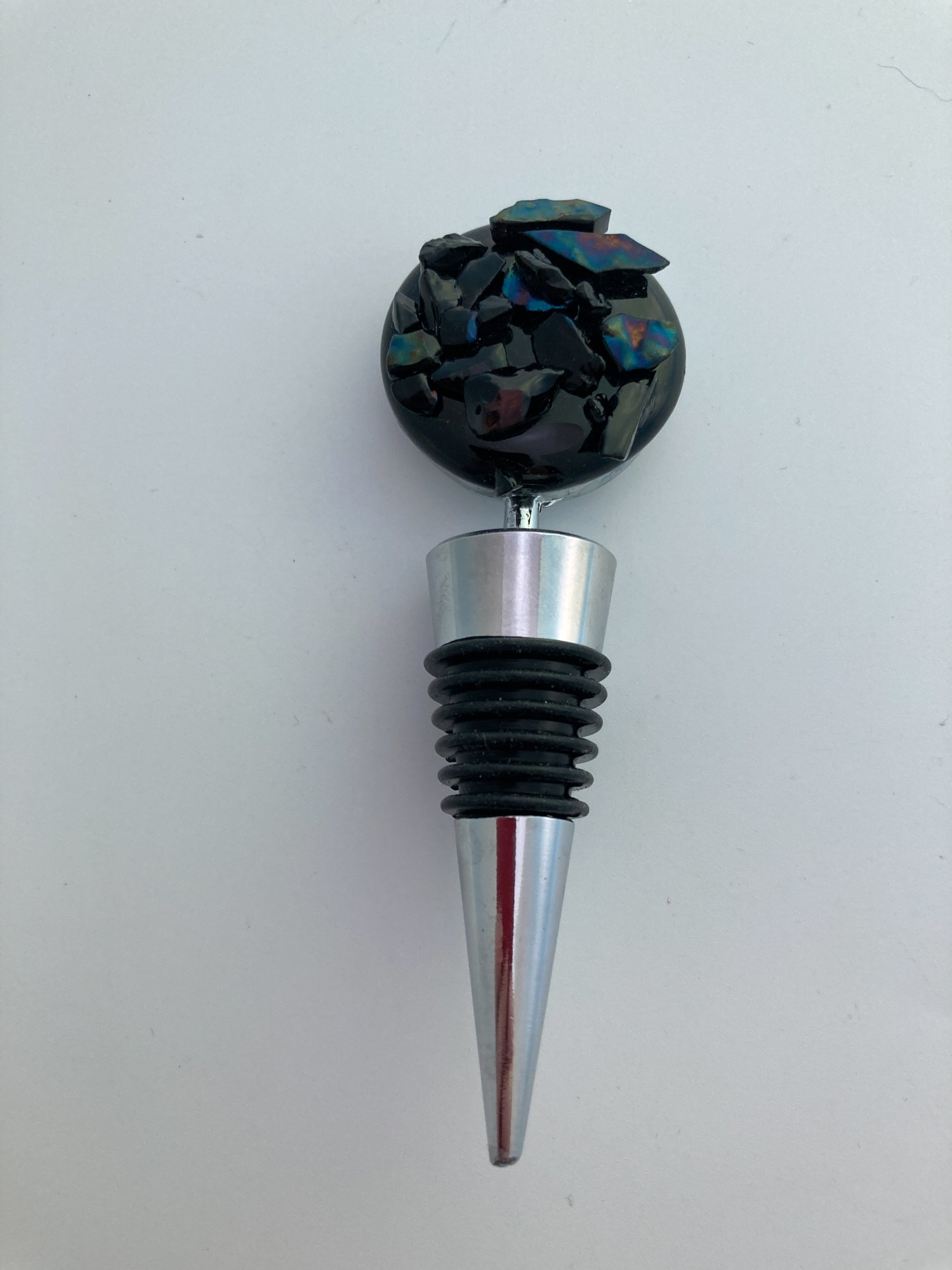 Black dichroic bits decorate this conical shape wine stopper made of zinc alloy and food-grade silicone rubber seal, topped with unique fused glass pieces.