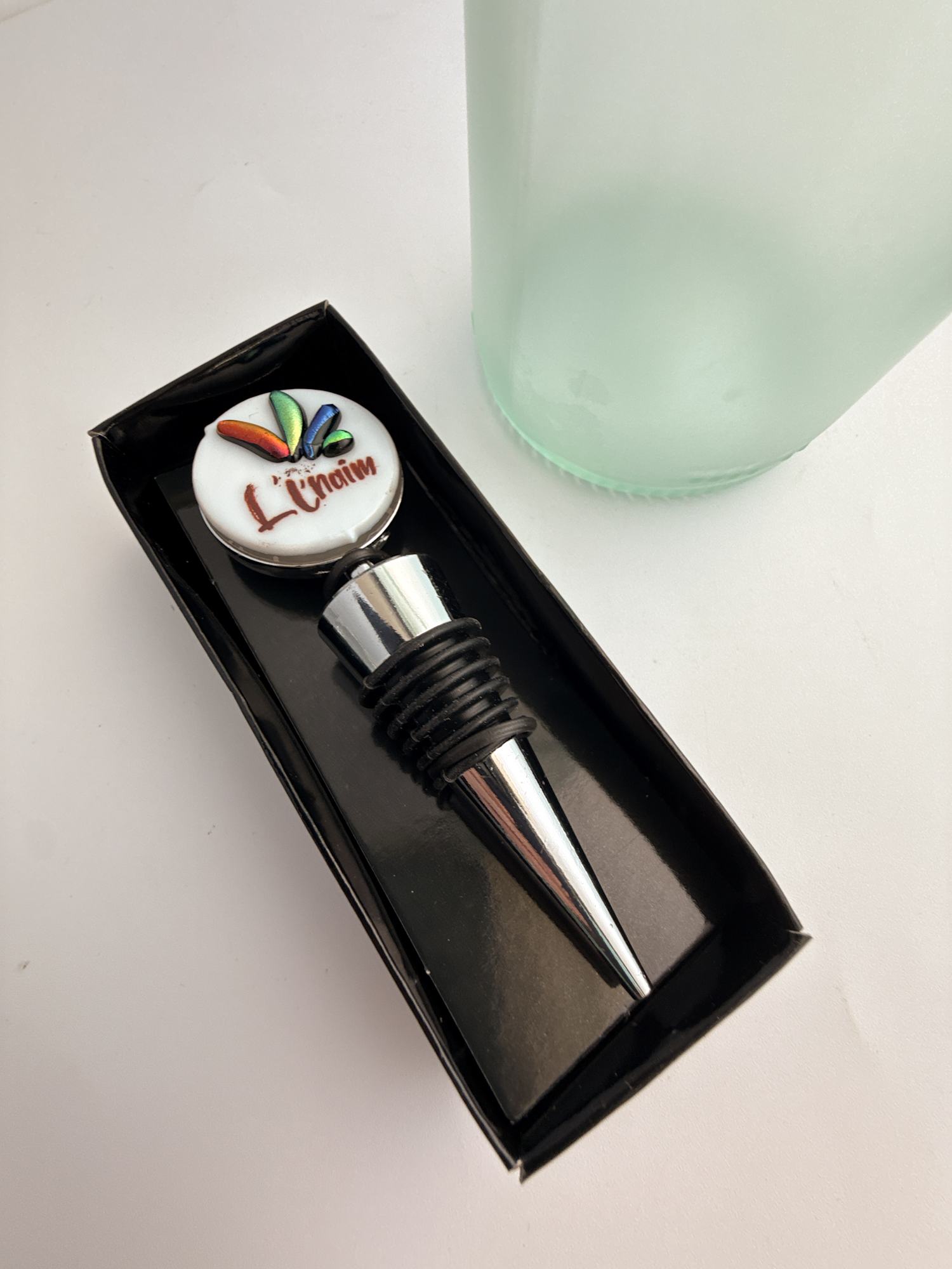 Decorative conical shape wine stopper made of zinc alloy and food-grade silicone rubber seal, topped with unique fused glass pieces.