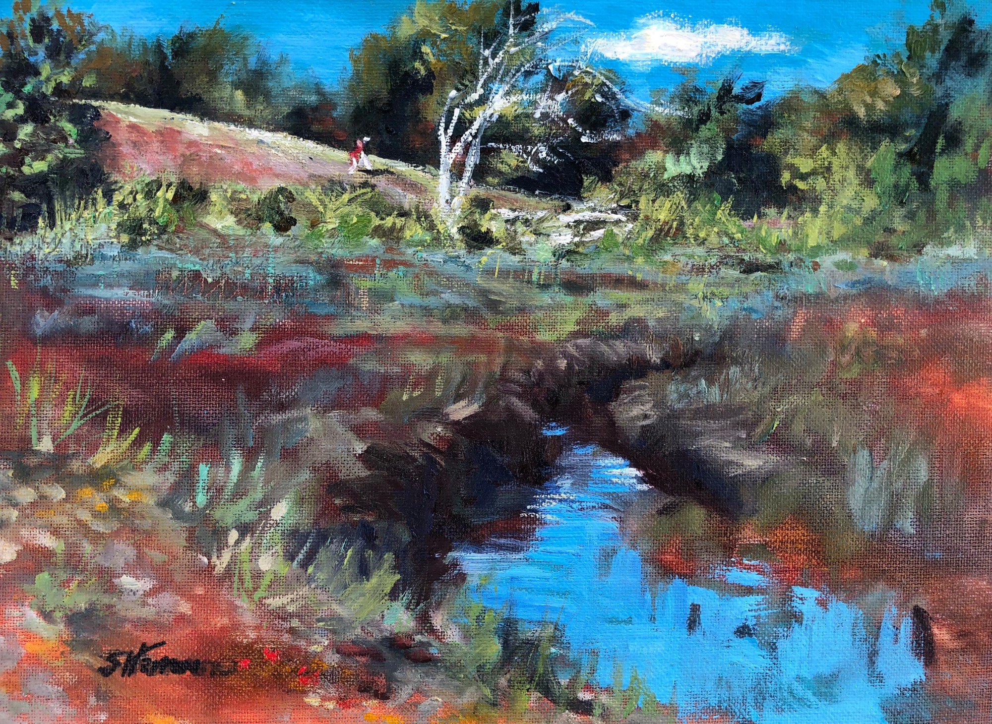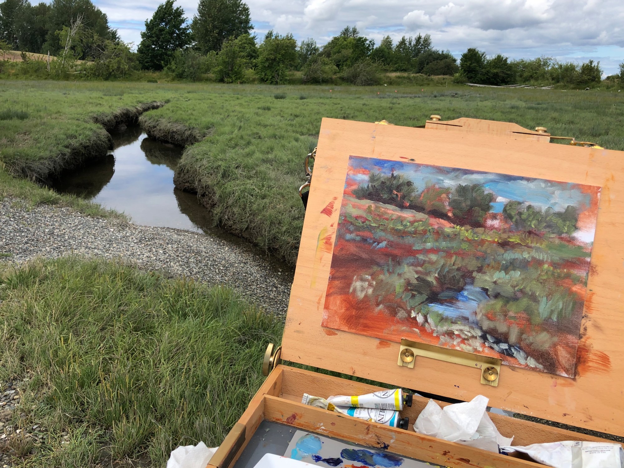 Painting outside in the wind at Blackie Spit in Crescent Beach was a real adventure. It was critical to capture the important details very quickly, as the clouds were moving so fast – like an action movie clipping along, and the real life colors were changing by the minute. My outdoor gear was wanting to lift off, as was my hat. Even the dead tree was leaning in the wind.