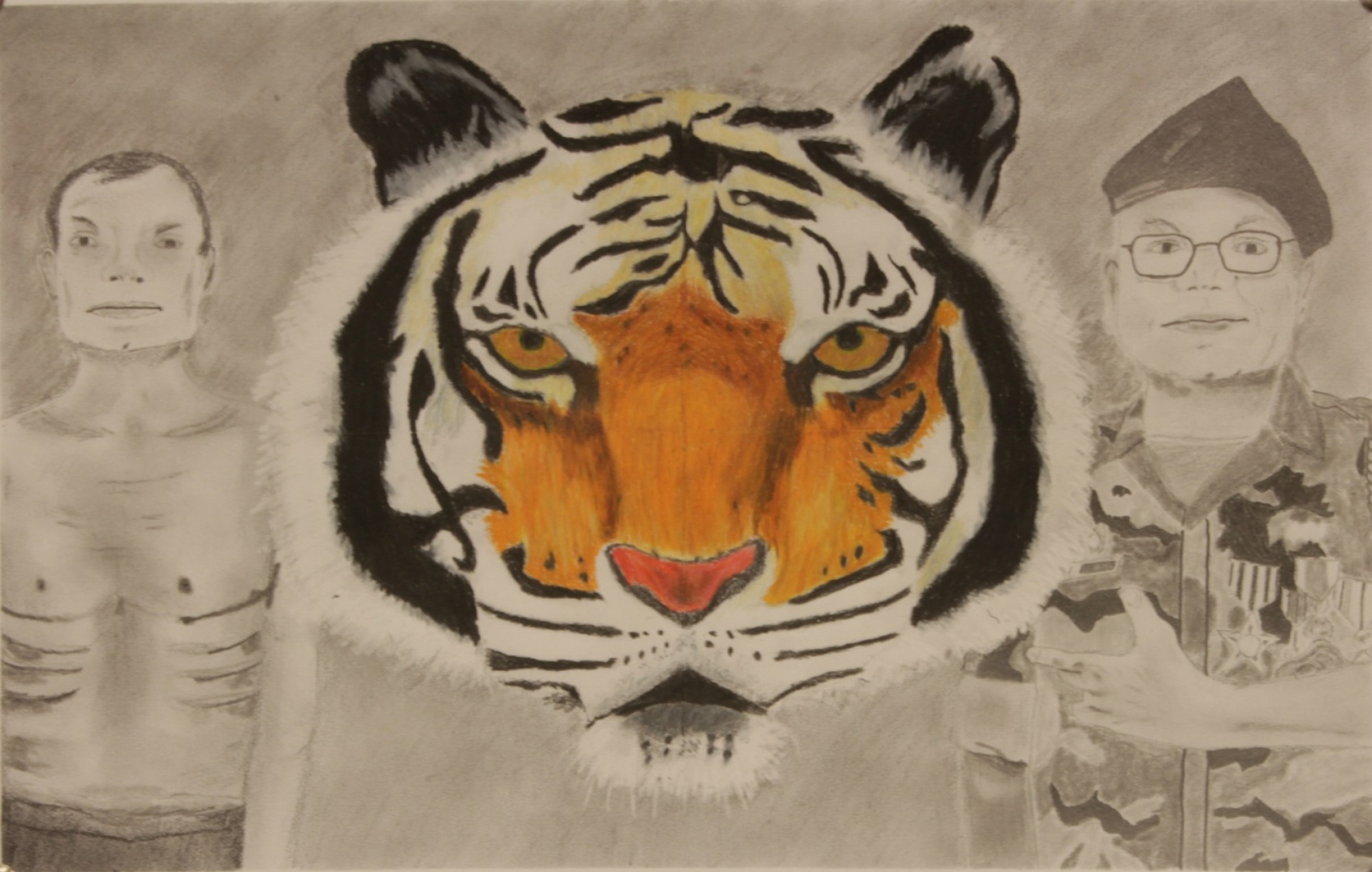Excerpt from artist’s Impact Statement: "[Tran Ngor] told us as a prisoner he was treated horribly and had little food so his body got weaker and weaker but his spirt stayed strong. Just like a tiger on the end of its run becomes older and weaker, yet they still have the strong spirit of the 'king of the jungle'. This is where I got the vision of Harry being represented as a tiger in my drawing."