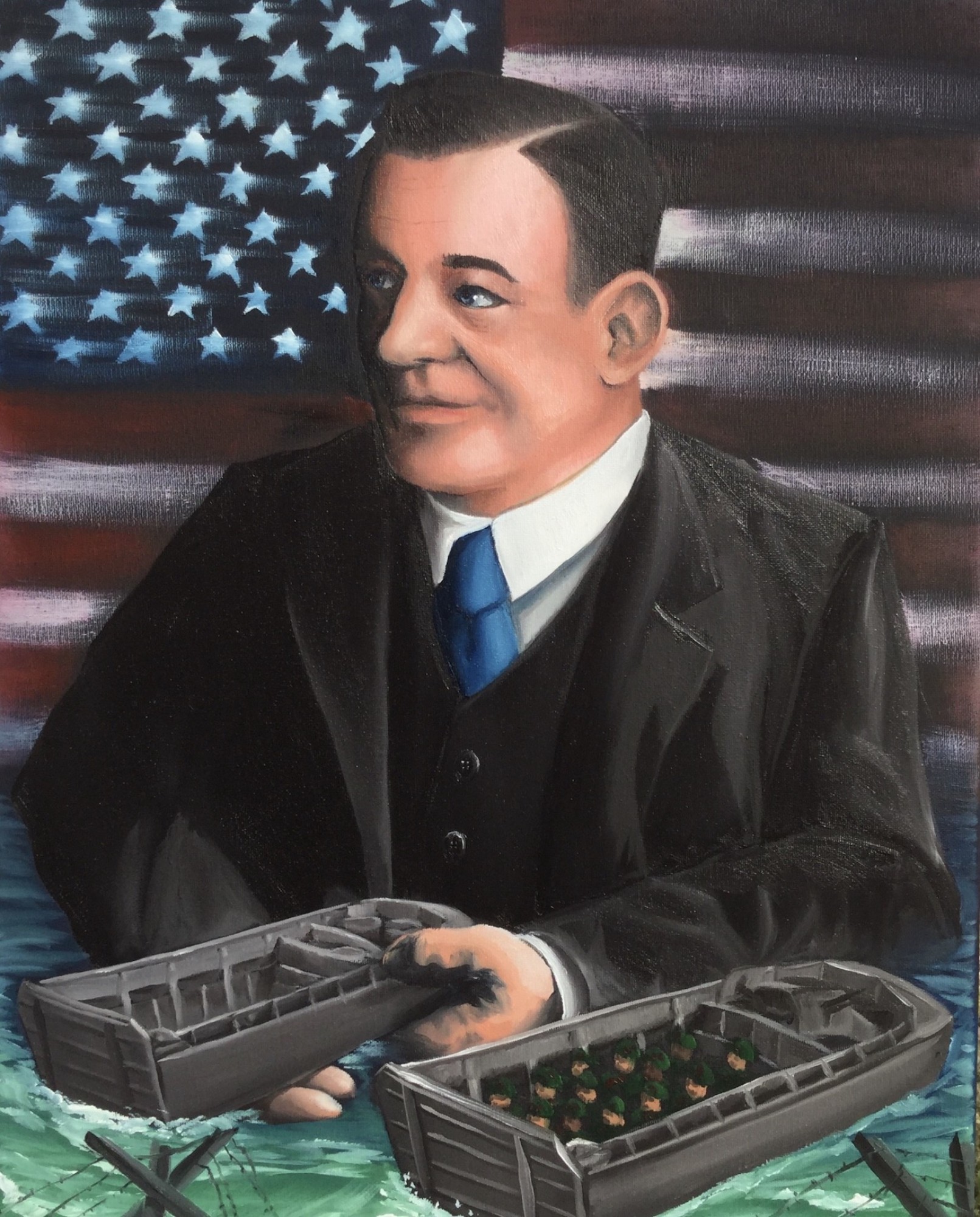 Excerpt from artist’s Impact Statement: "In my artwork, I presented Mr. Higgins reaching out and giving his ship to assist in the war. The Higgins's boat was famously used on D-Day, so to help the viewer connect to this event, I included Czech Hedgehogs, barbed wired, and the slight change in the color of the water to allude to the upcoming deadly beach."