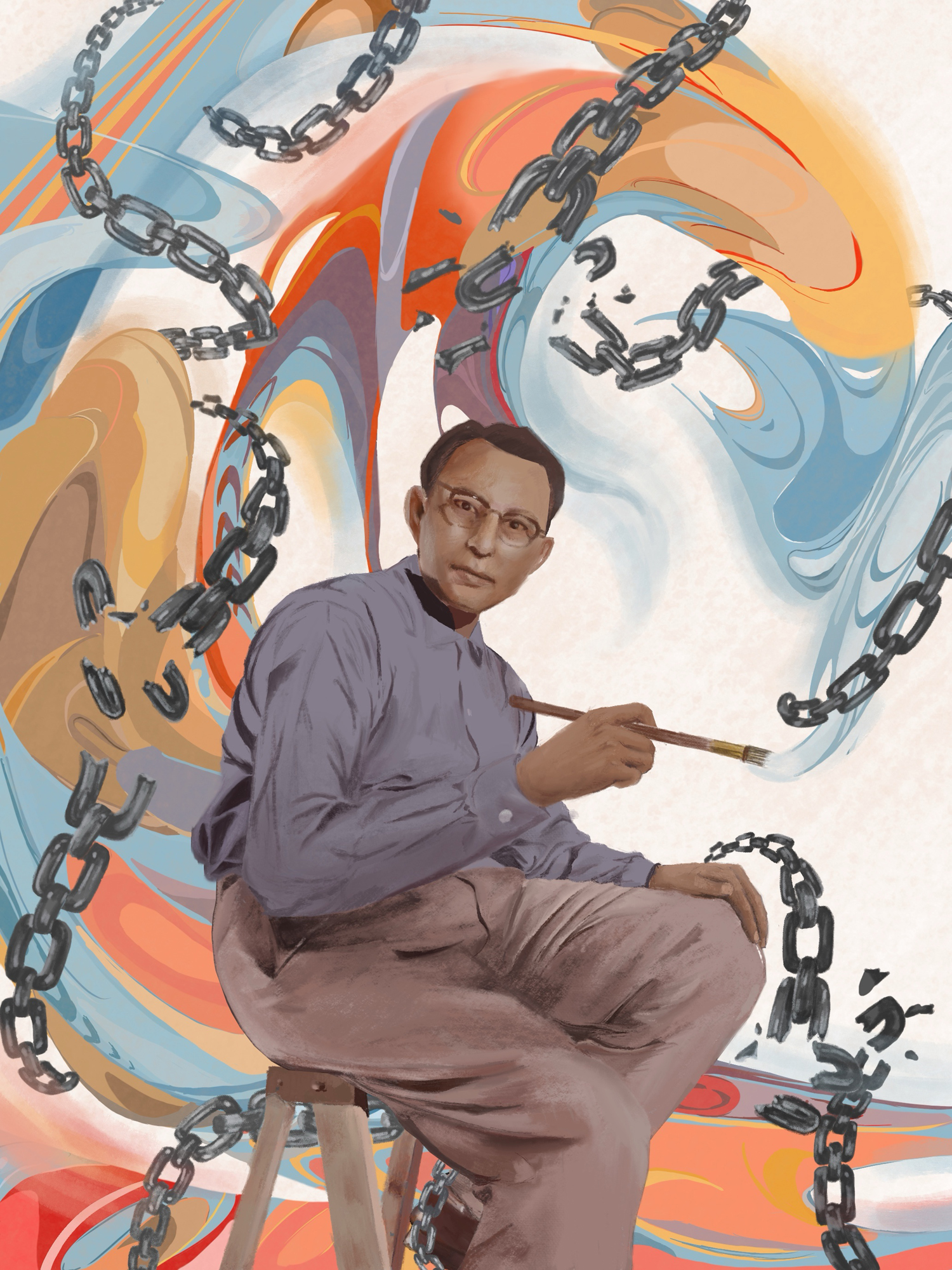 Excerpt from artist’s Impact Statement: "I wanted to capture Oscar Howe’s artistic energy and his fight for the change of prejudice and stereotypes. I created a digital painting showing him holding a brush, surrounded by broken chains and vibrant swirling colors."