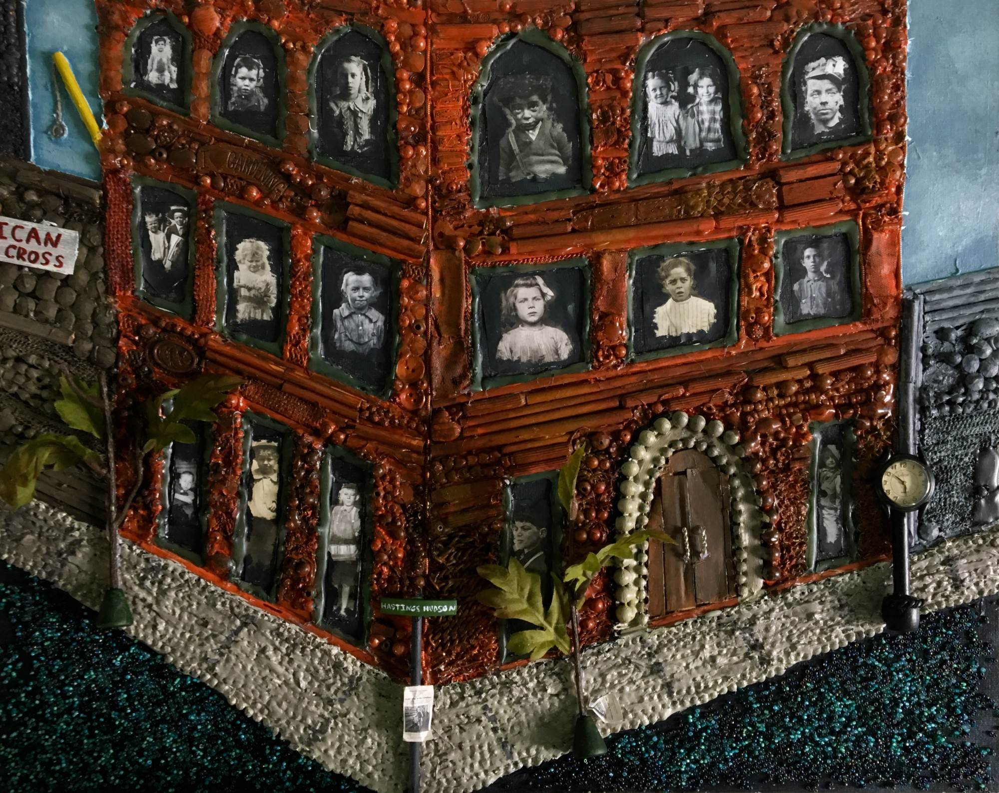 - Acrylic paint, printed photos, found objects (including beads, jewelry, fake flower branches) on canvas.