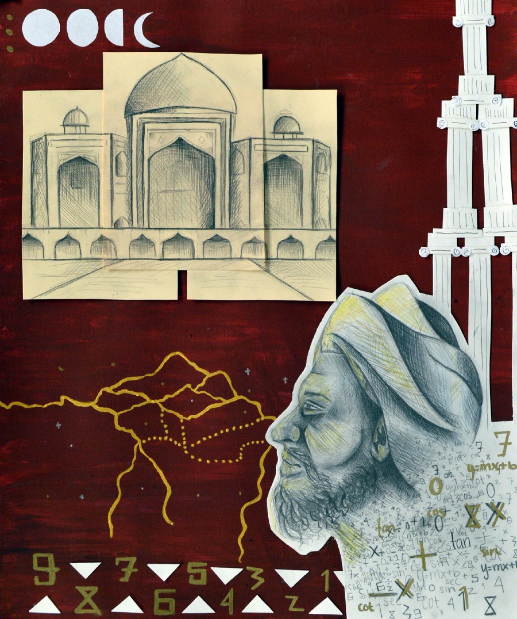 Excerpt from artist’s Impact Statement: "I used the color scheme of gold and burgundy to highlight the importance of the silk road around the time Abu Ja'far Muhammad ibn Musa al-Khwarizmi thrived. Not only was it the source of wealth, but because of the silk road, communication was available throughout the old world. Thus, Abu Ja'far Muhammad ibn Musa al-Khwarizmi’s work was able to find and enrich the knowledge of every society."