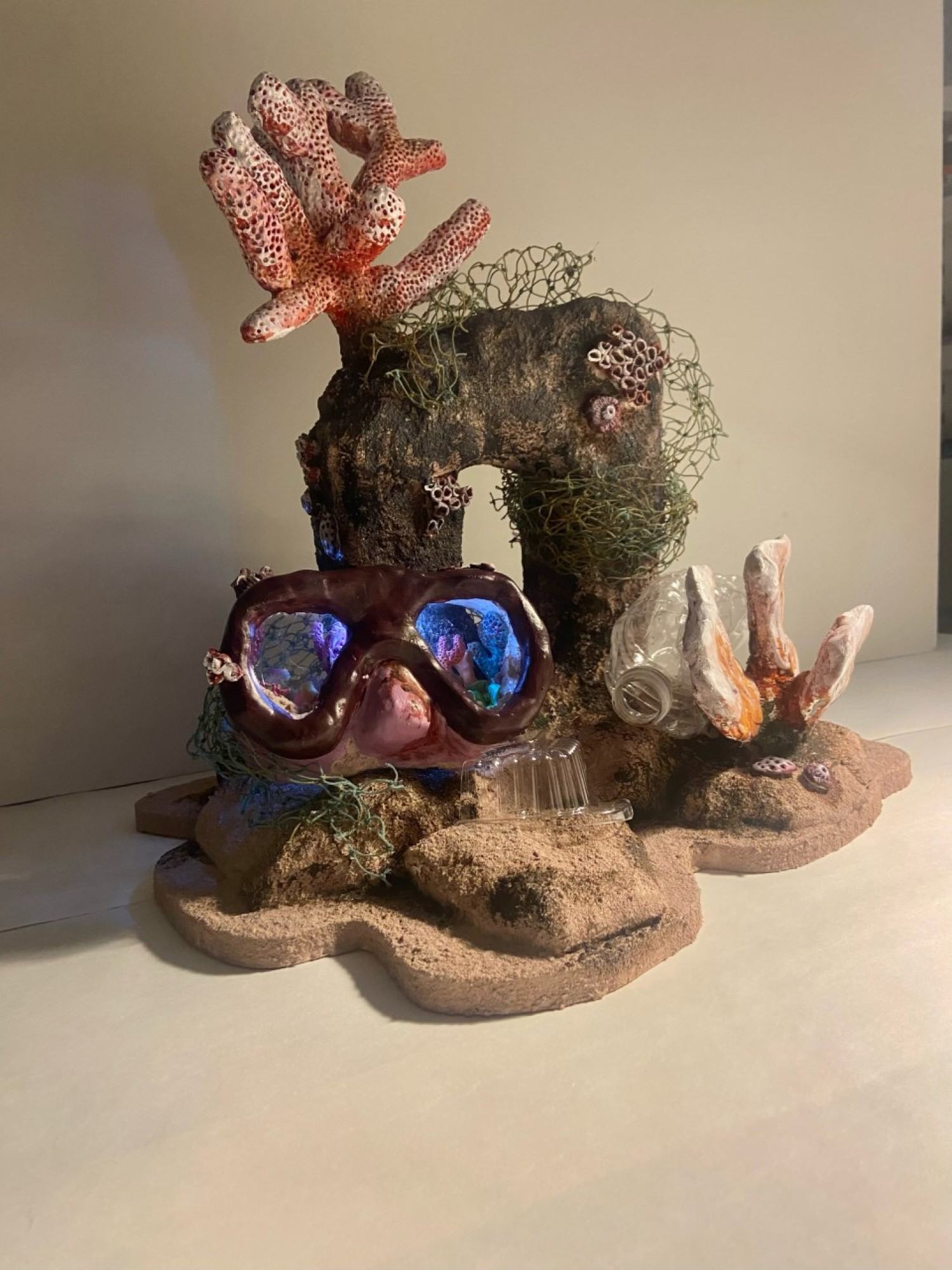 Excerpt from artist’s Impact Statement: "I built goggles that are surrounded by polluted coral reefs and within the goggles there is a healthy coral reef glistening with saturated pigments and this is only the smallest portion of the vision she saw and how amazing the untouched and undisturbed reefs can be but they can all be this great if issues such as pollution and over fishing were brought down then not only the waters would be saved but it would help the earth as we know it."